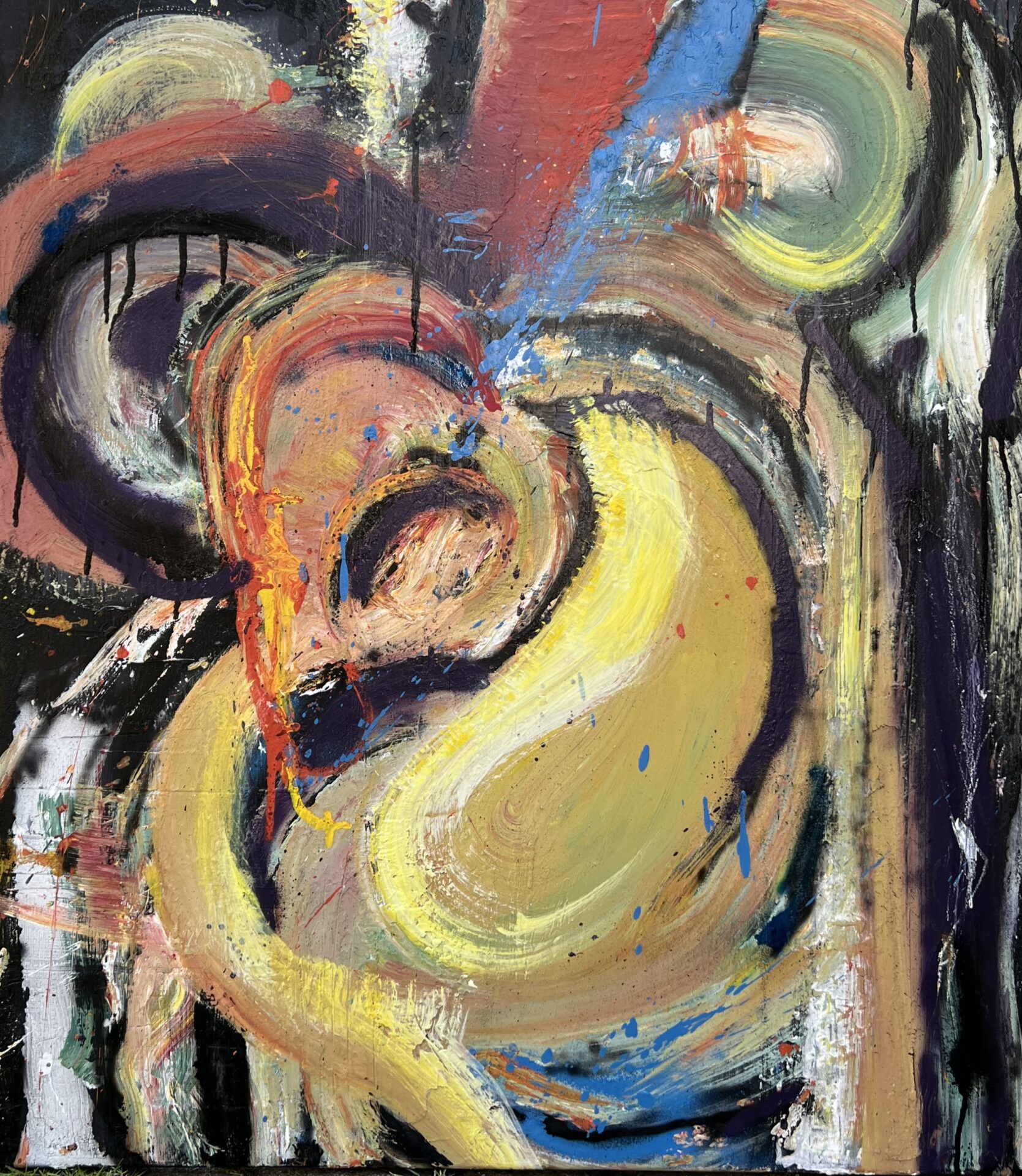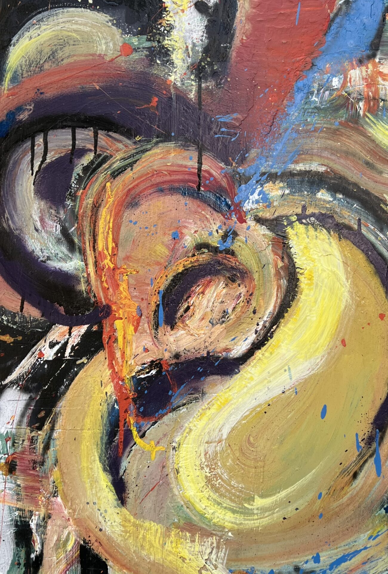 Obraz namalowany na płótnie, technika mieszana. Posiada fakturę, która powstała na skutek używania szpachli. Tematyka nawiązuje do sztuki ulicy , Street Artu, graffiti.