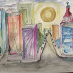 Nowoczesna Akwarela w połączeniu z cienkopisem o radosnych ciepłych barwach. Namalowana na papierze 300 g.