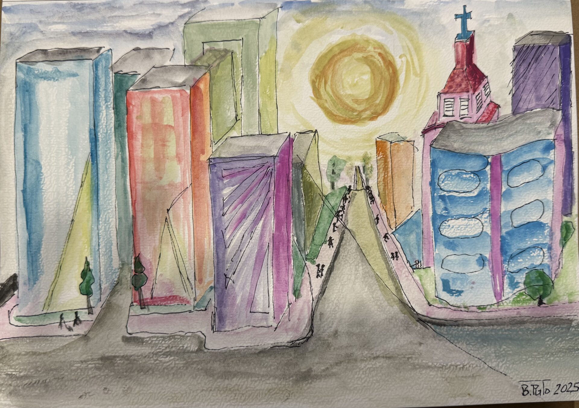 Nowoczesna Akwarela w połączeniu z cienkopisem o radosnych ciepłych barwach. Namalowana na papierze 300 g.