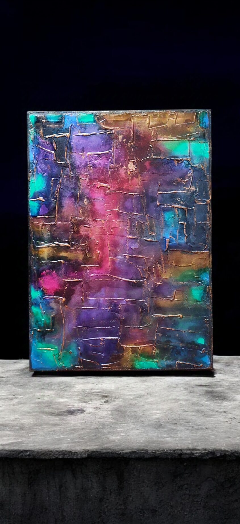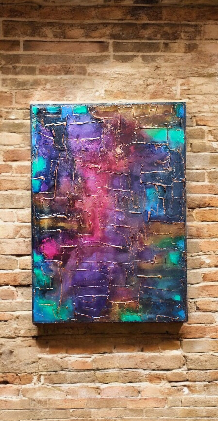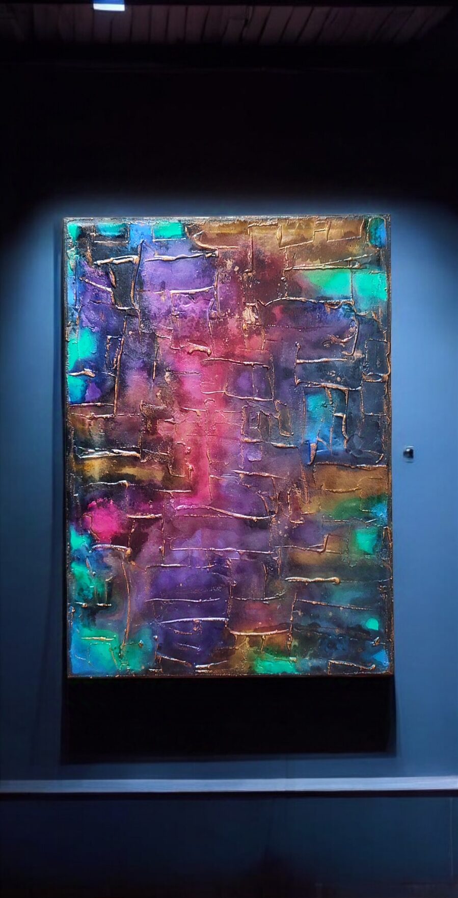 Obraz strukturalny stworzony różnymi mediami, piękne przechodzące przez siebie kolory, podkreślone złotem. Myślę, że w każdym wnętrzu będzie się pięknie prezentować.