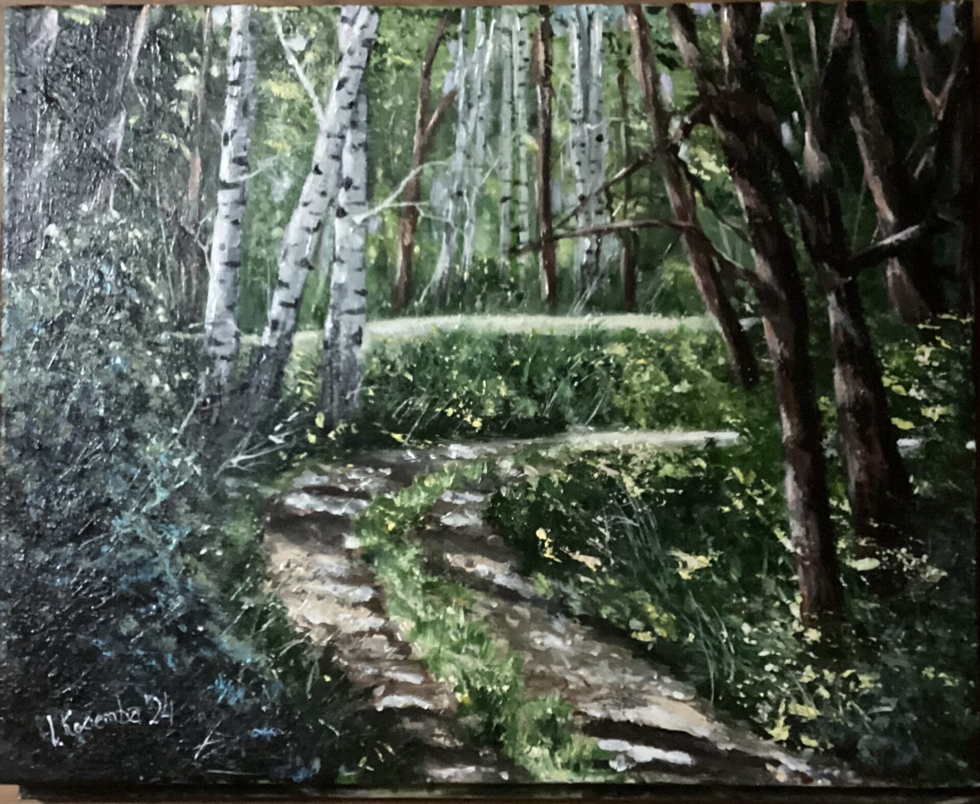 Tematem pracy jest leśna ścieżka w słoneczny dzień. Promyki słonca prześwitujące przez listowie tworzą -nieodmiennie mnie fascynującą-mozaikę światła i cienia. Spacer po takich leśnych drogach to wspaniały sposób na chwilę relaksu, wyciszenia, oderwania się od pędzącego wciąż natłoku myśli i zdarzeń .Praca powstała wiosną tego roku. Utrzymana w kojących ,stonowanych odcieniach zieleni może być namiastką odprężających leśnych wędrówek , zwłaszcza ,jeśli okoliczności uniemożliwiają prawdziwą wyprawę .