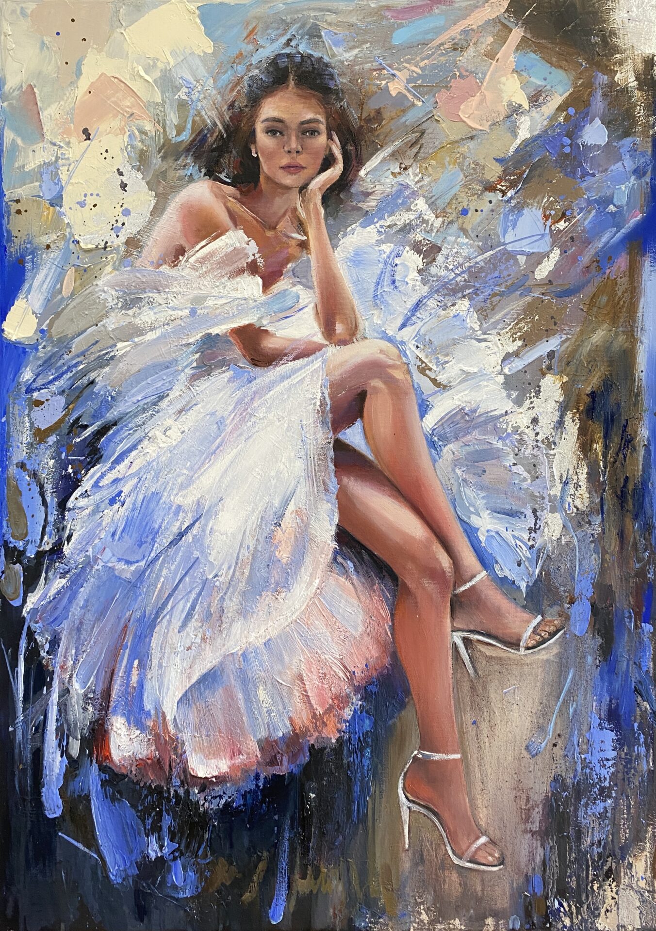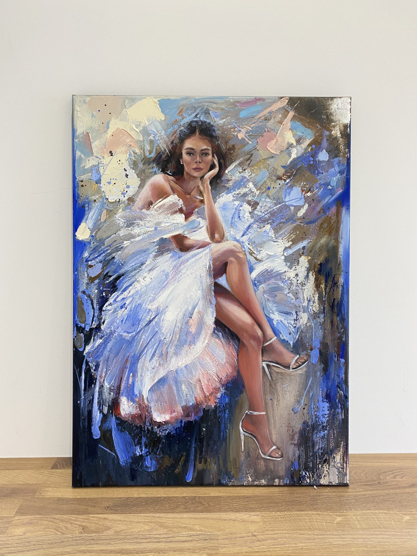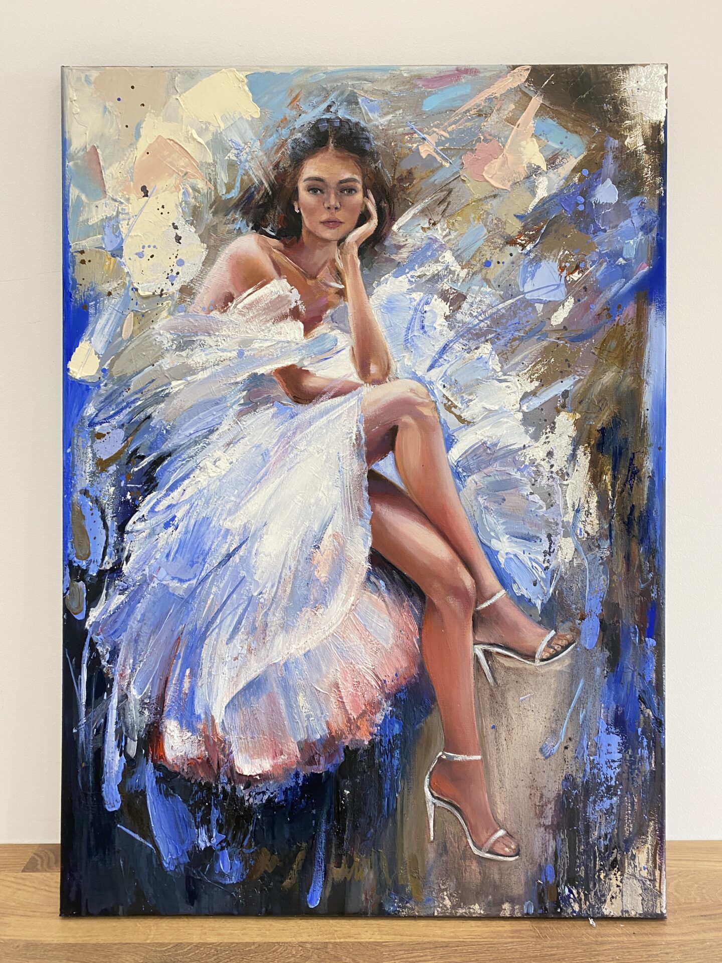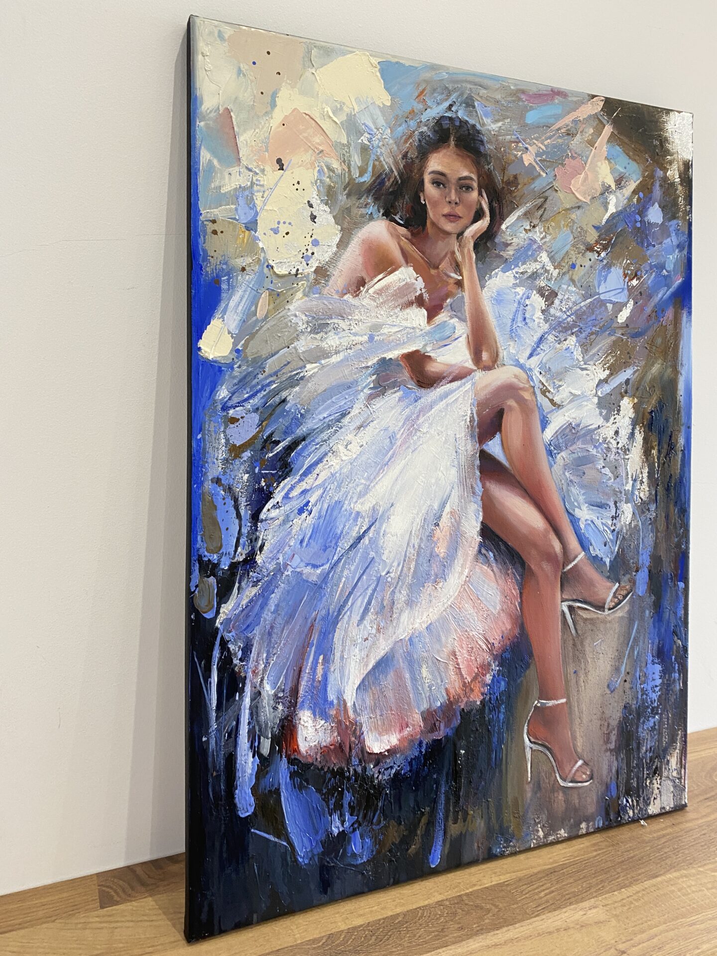 -Obraz malowany farbami olejnymi na płótnie bawełnianym o wymiarze 70x50cm, z niewielkimi dodatkami płatków srebra, rok wykonania 2024.