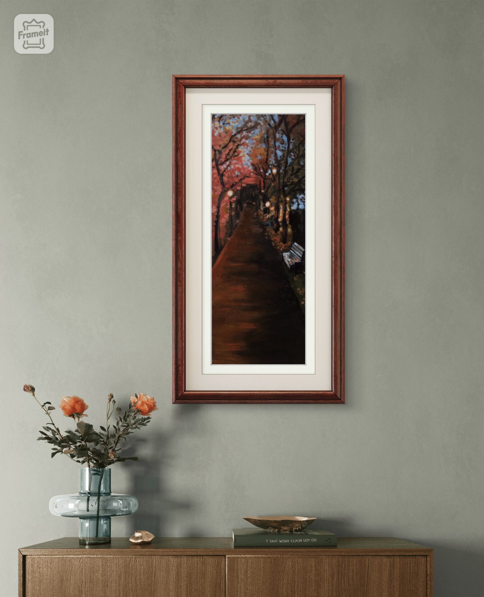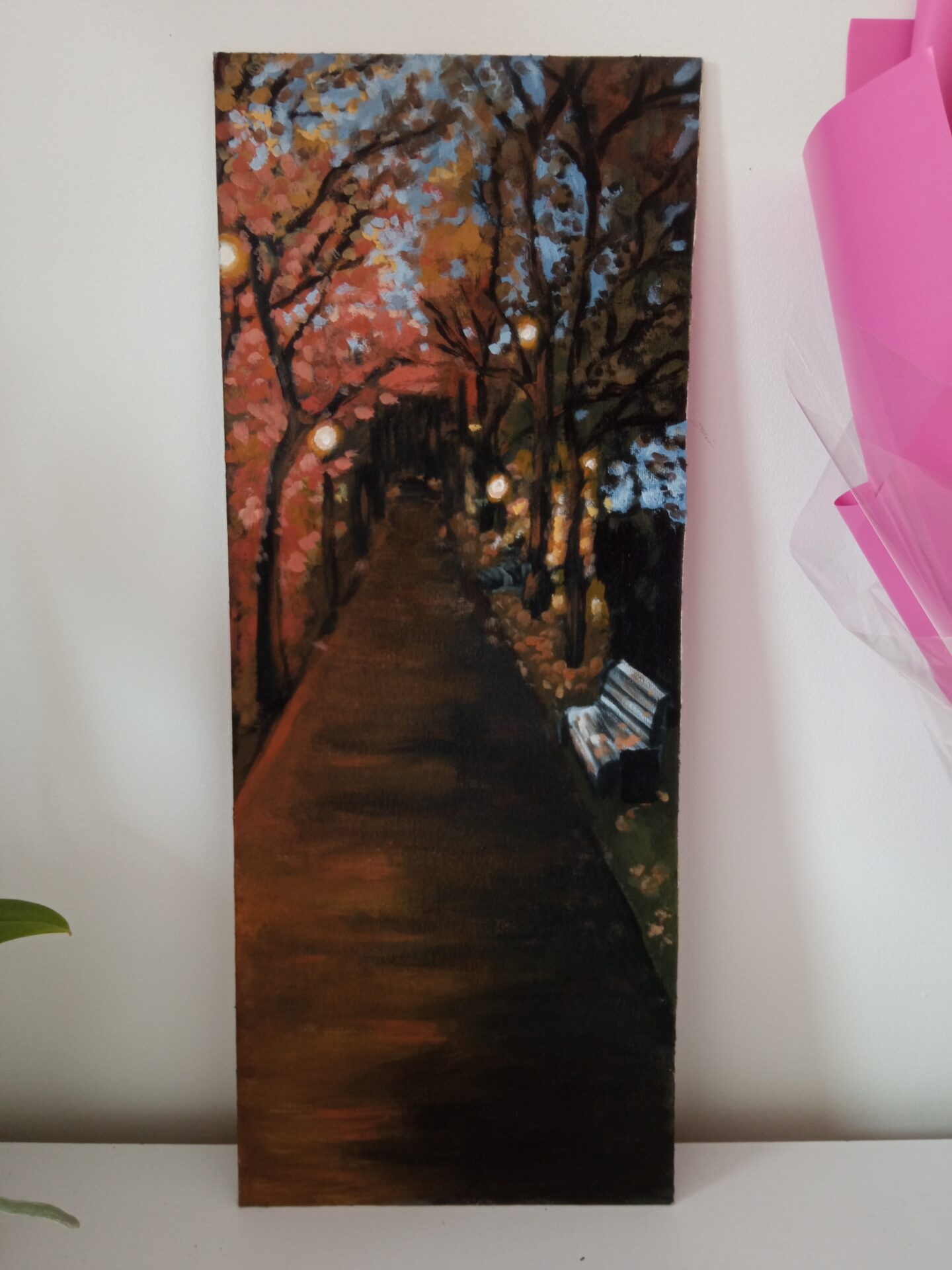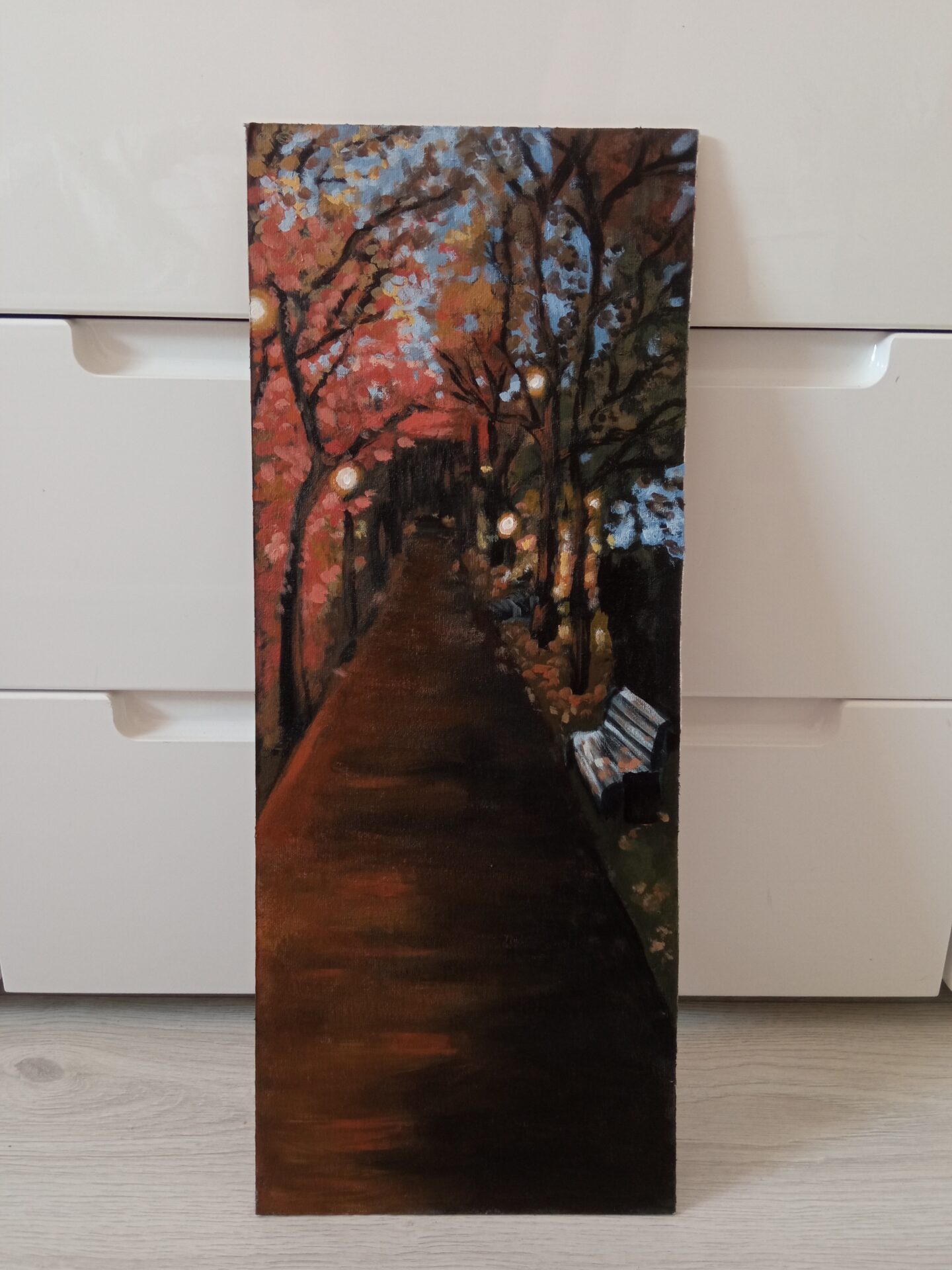 Jesień w deszczowy dzień w parku . Klimatyczny obraz namalowany farbami akrylowymi na panelu malarskim