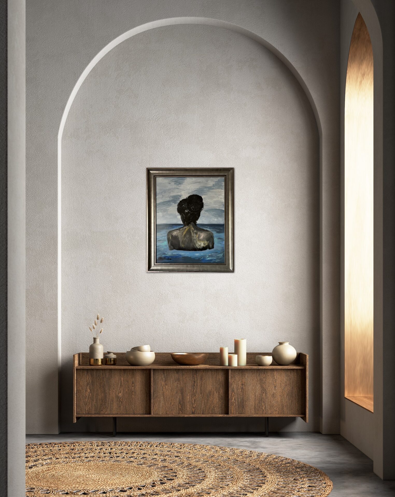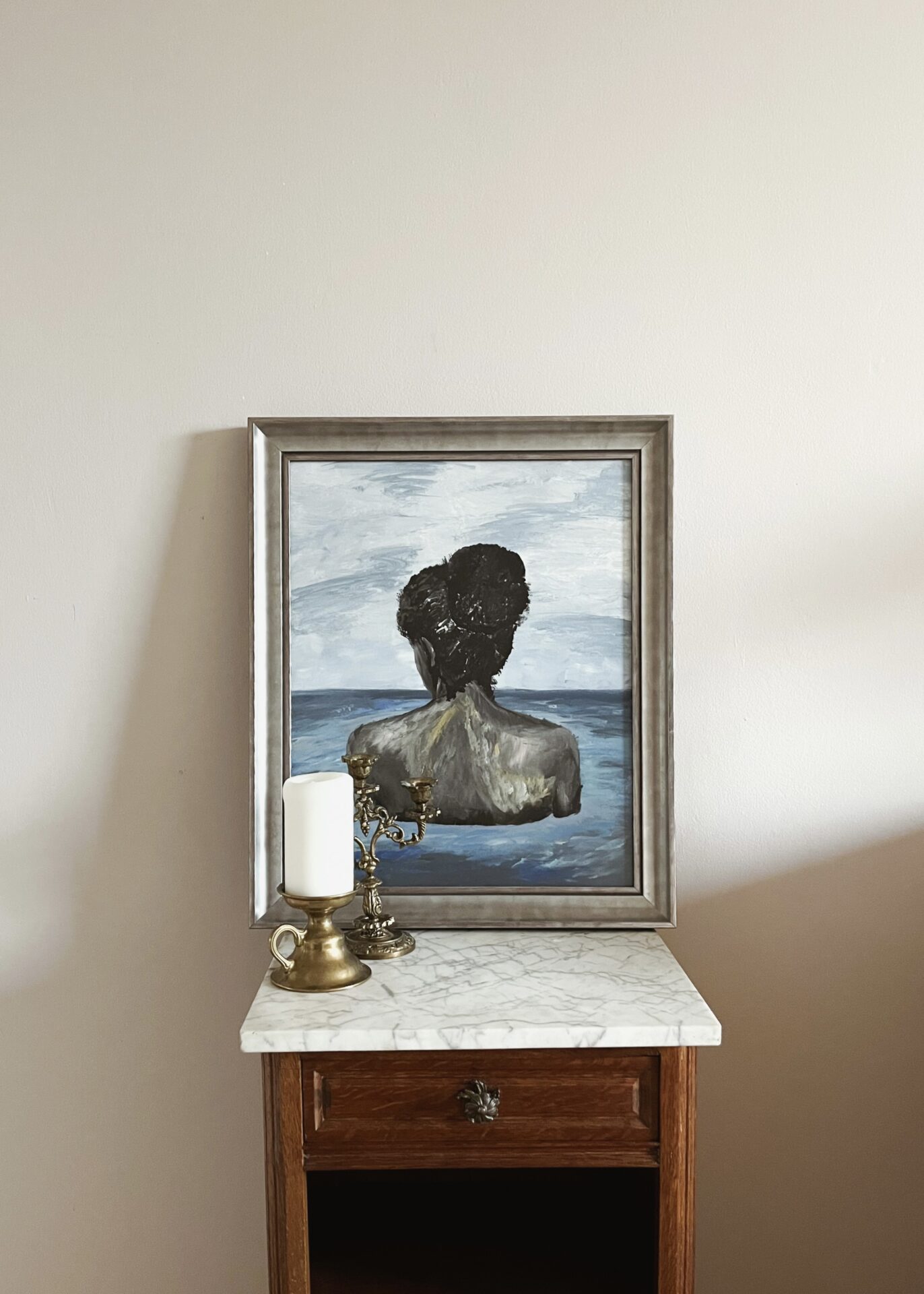 Obraz jest oprawiony w srebrną ramę, posiada matową szybę przez co efekty obrazu zdają się być realniejsze.