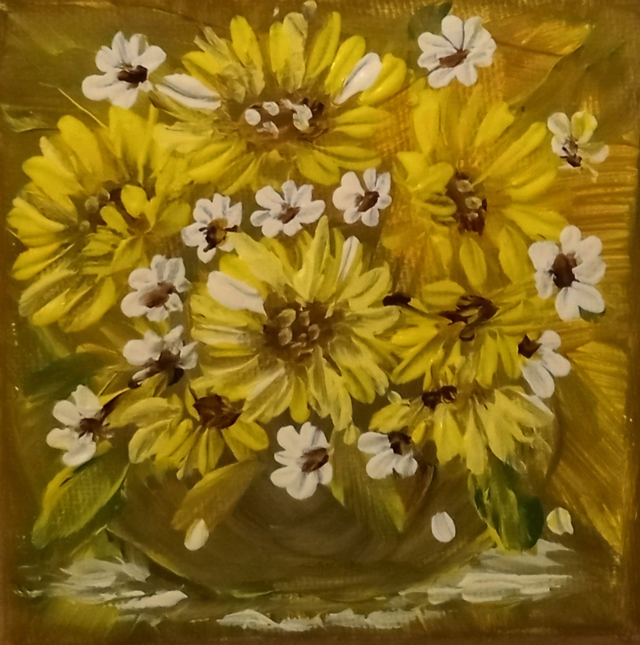 Obraz namalowany na profesjonalnym podobraziu . Płótno nabite na sosnowe krosno. Użyte zostały wysokiej jakości farby akrylowe. Wymiary 10 x 10 Do pracy dołączam certyfikat. Jest to moja praca. Obraz jest sygnowany i zawerniksowany. Boki zamalowane w tonacji obrazu.