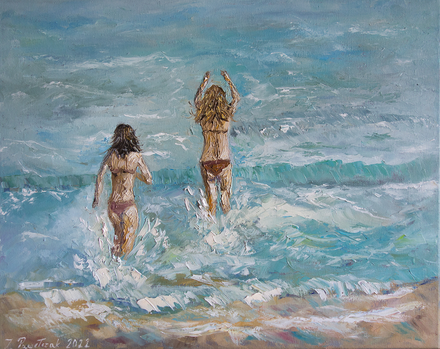 Obraz olejny na podobraziu płóciennym malowany szpachelką malarską w technice alla prima z widoczną fakturą farby.