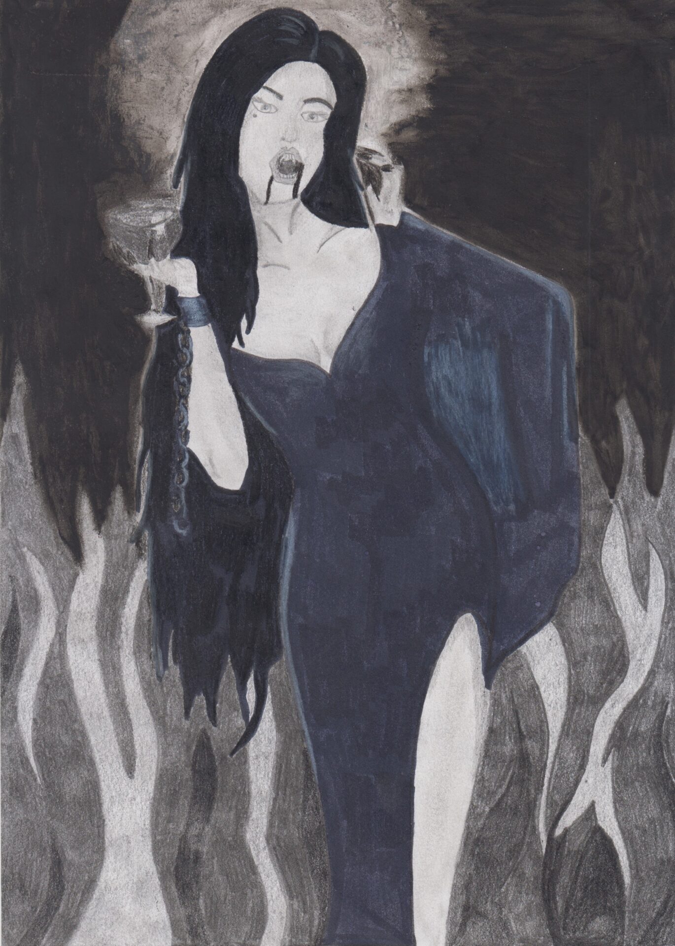 Rysunek jest zainspirowany filmem Dracula. Przedstawia wampirzyce tak jak ja sobie ją wobrarzam. W ręce trzyma kielich z krwią, którą pije. W tle widać płomienie i księżyc. Jest pokolorowana węglem i ołówkiem.