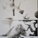 Obraz urzeka delikatną paletą szarości, które przechodzą w głęboki, niemal czarny odcień. Kształty są enigmatyczne: prostokąty, łuki i okręgi splatają się w dynamicznej kompozycji. Jakby artysta bawił się kontrastem i przestrzenią, wprowadzając widza w stan lekkiej dezorientacji. Atmosfera obrazu jest tajemnicza, prawie jakbyśmy patrzyli na kosmiczny krajobraz. Może ciutko surrealistyczna. Styl przypomina techniki grafiki, z precyzyjnymi liniami i cieniowaniem, które nadają pracy trójwymiarowość.