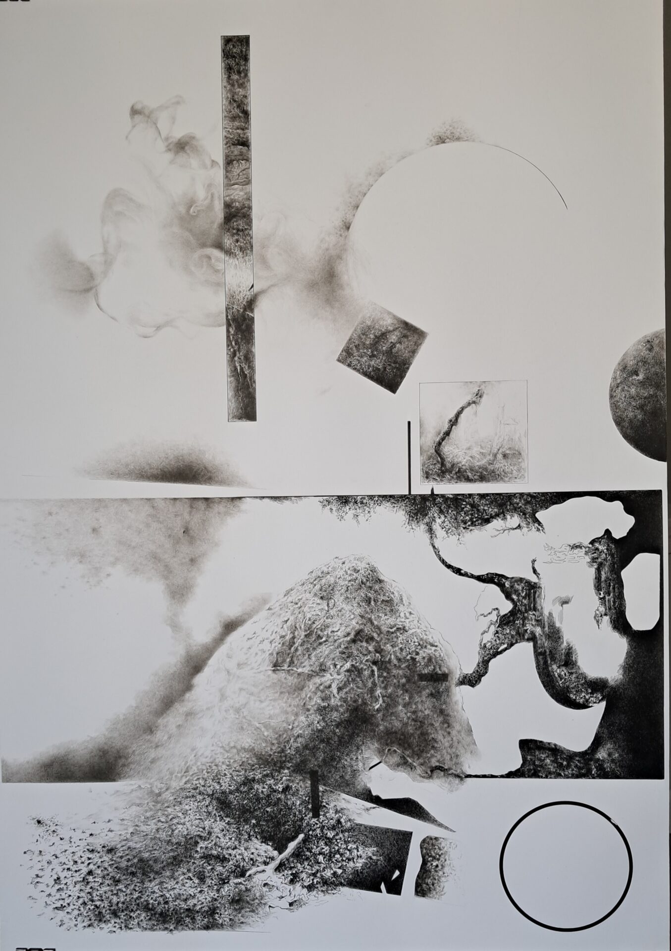 Obraz urzeka delikatną paletą szarości, które przechodzą w głęboki, niemal czarny odcień. Kształty są enigmatyczne: prostokąty, łuki i okręgi splatają się w dynamicznej kompozycji. Jakby artysta bawił się kontrastem i przestrzenią, wprowadzając widza w stan lekkiej dezorientacji. Atmosfera obrazu jest tajemnicza, prawie jakbyśmy patrzyli na kosmiczny krajobraz. Może ciutko surrealistyczna. Styl przypomina techniki grafiki, z precyzyjnymi liniami i cieniowaniem, które nadają pracy trójwymiarowość.