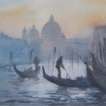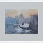 Delikatna akwarela przedstawiająca romantyczny poranek w Wenecji. Mgła subtelnie otula miasto, a gondole suną po wodzie, odbijając złote refleksy wschodzącego słońca.