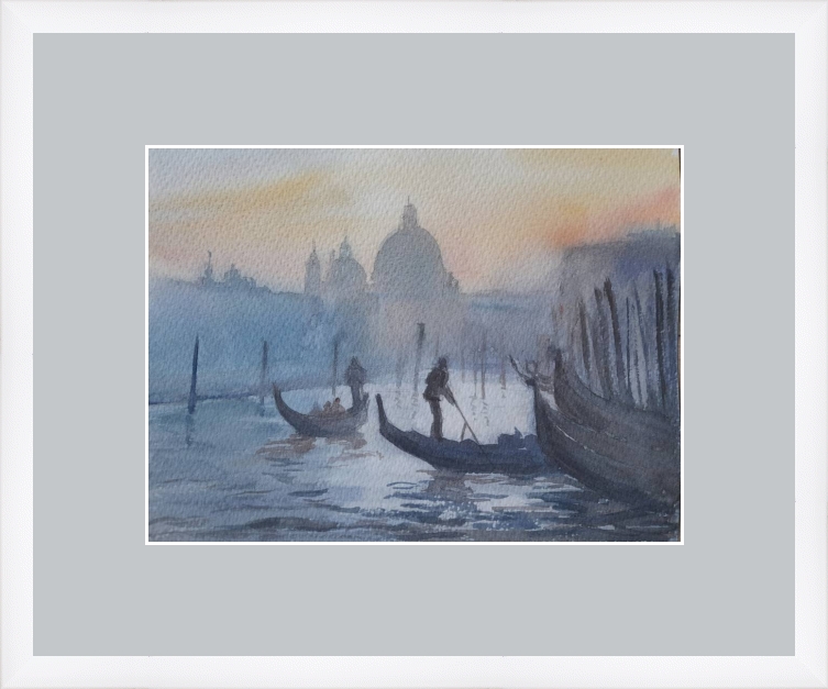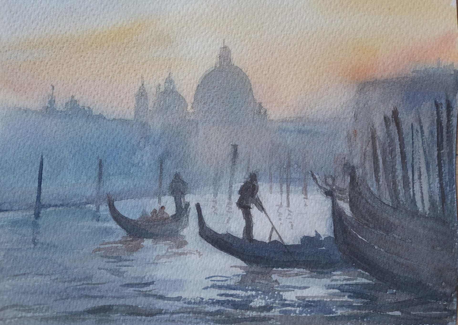 Delikatna akwarela przedstawiająca romantyczny poranek w Wenecji. Mgła subtelnie otula miasto, a gondole suną po wodzie, odbijając złote refleksy wschodzącego słońca.