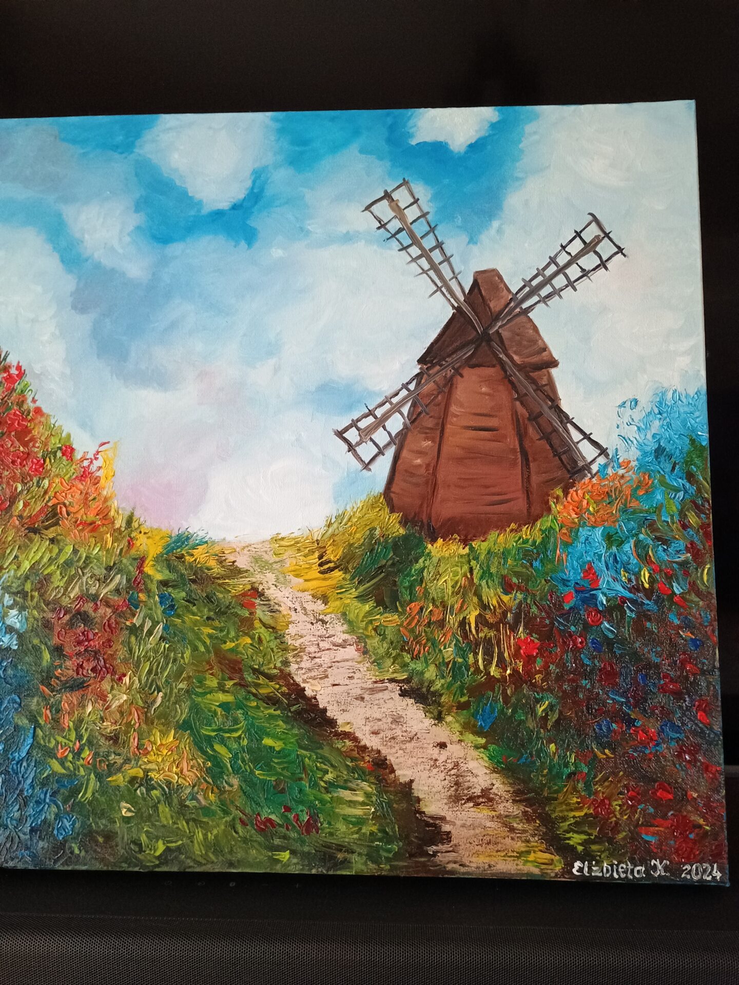 Obraz namalowany jest farbami olejnymi Van Gogh, zabezpieczony werniksem. Wymiary to 50x50x3 cm. Obraz nie wymaga oprawy w ramę. Grubo nakładana farba daje świetny efekt wizualny. Żywe kolory rozweselą każde pomieszczenie.