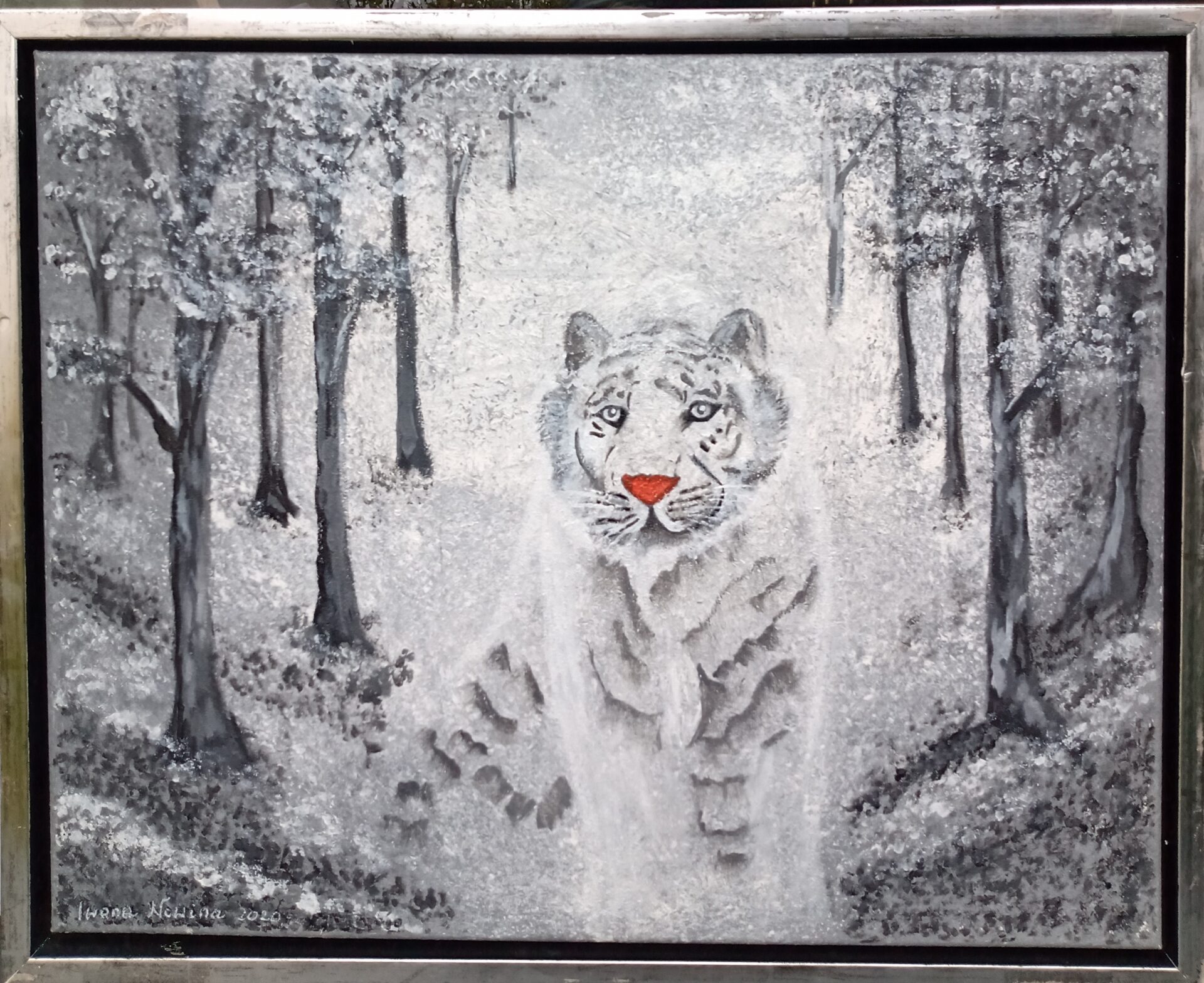 Jeden z moich wczesnych obrazów. Trochę groteska, coś innego. Obraz oprawiony w ramę kasetonową, stylizowaną na staroć. Szerokość samej ramy 1,5 cm, grubość od ściany 4 cm. Podane wymiary bez ramy.