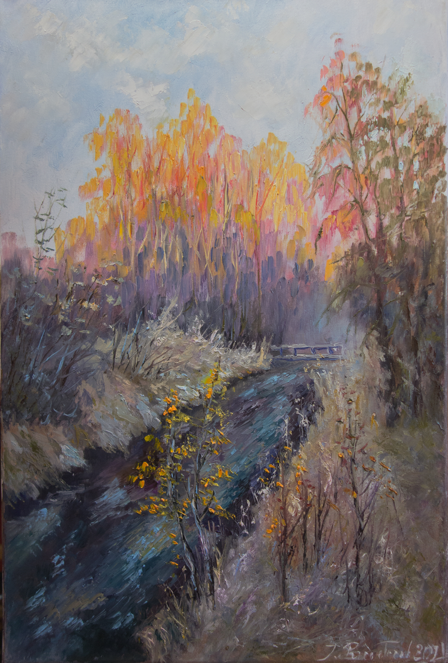 Obraz olejny na podobraziu płóciennym w technice alla prima z widoczną fakturą farby.