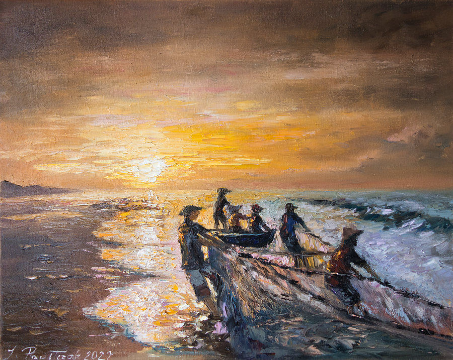 Obraz olejny na podobraziu płóciennym malowany szpachelką malarską w technice alla prima z widoczną fakturą farby.