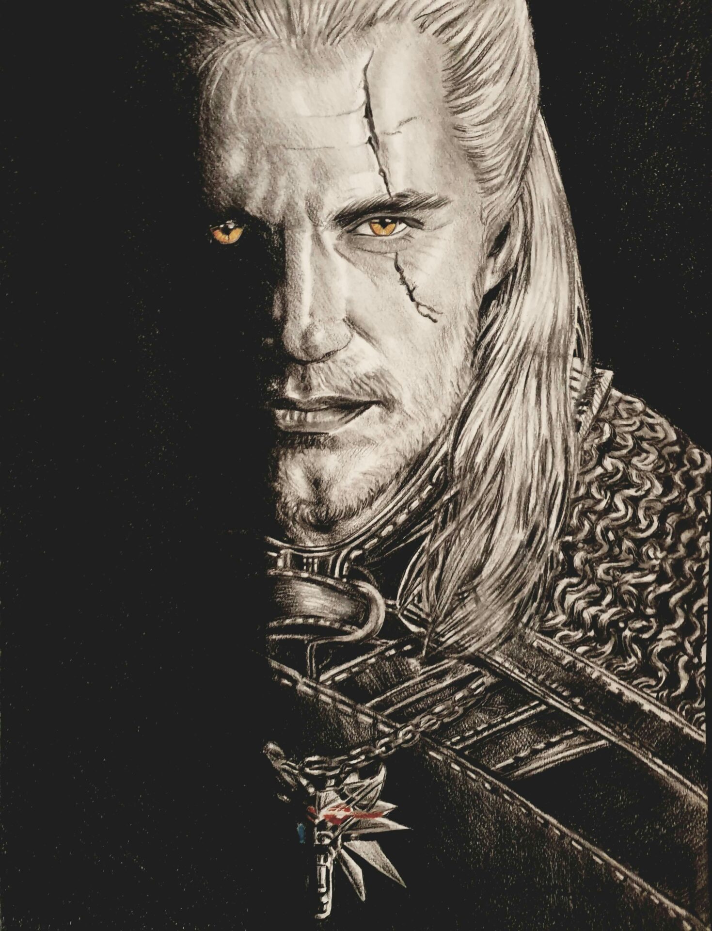 Obraz wykonany został profesjonalnymi grafitami oraz kredkami firmy Koh-i-noor na papierze fakturowanym renomowanej francuskiej firmy Canson. Rysunek powstal z okazji wystawy tematycznej pt. „Kadr z filmu”. Praca oprawiona jest w gustowne, eleganckie passe-partout o wymiarach 41 cm na 54 cm i sygnowana z przodu monogramem Jan Kasendra 2020. Rysunek może być miłym prezentem dla miłośników fantasy, twórczości literackiej Andrzeja Sapkowskiego, serialu sieci Netflix pt. „Wiedźmin” oraz gry komputerowej o tym samym tytule.