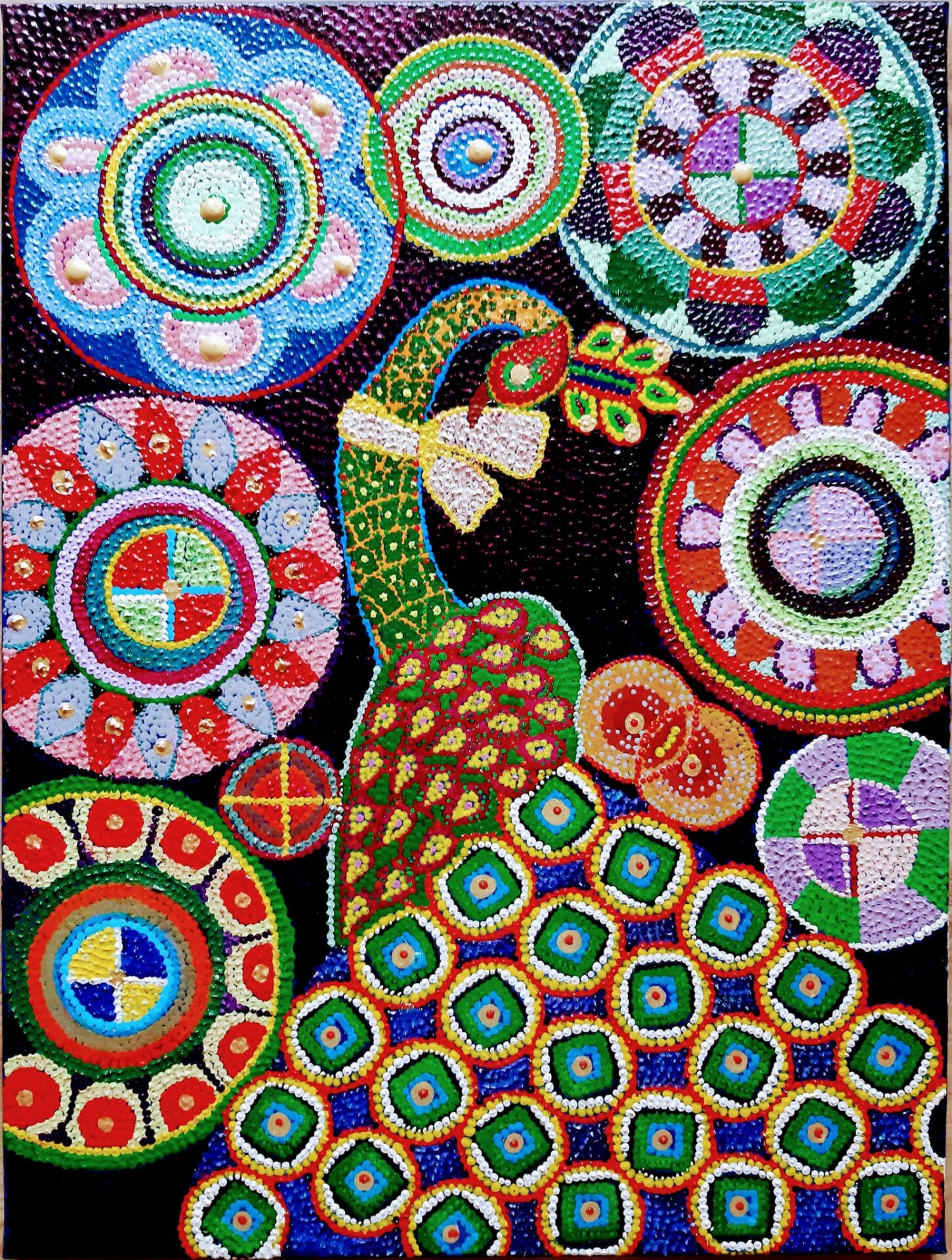 Na sprzedaż mandala 60×80 cm. inspirowana sztuką aborygenów. Całość wykonana własnoręcznie bez użycia szablonów,kropka po kropce , akryle na podobraziu. Zawerniksowany i pokryty różnokolorowym brokatem,co daje piękny efekt w świetle.Bardzo elegancki do dostojnych wnętrz.