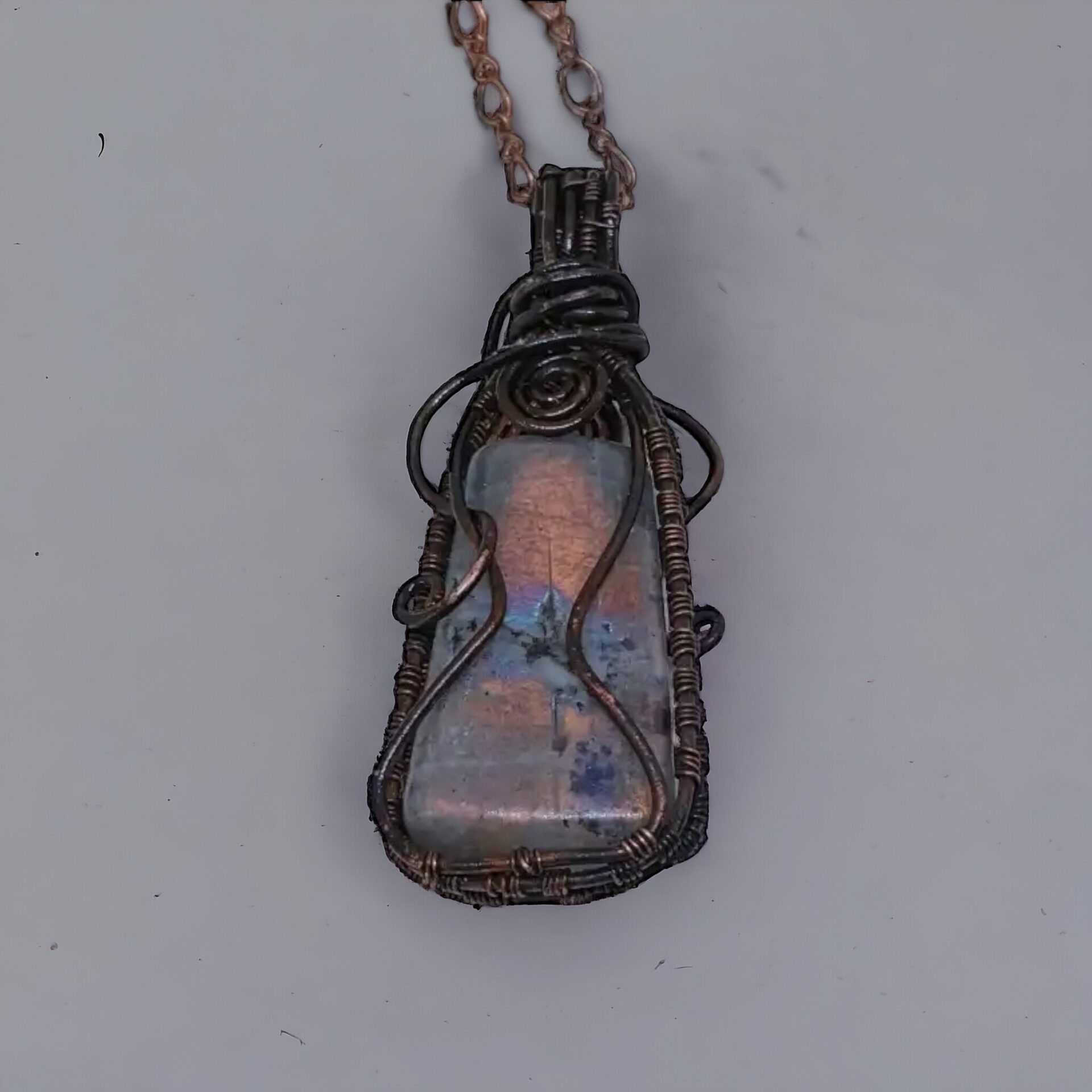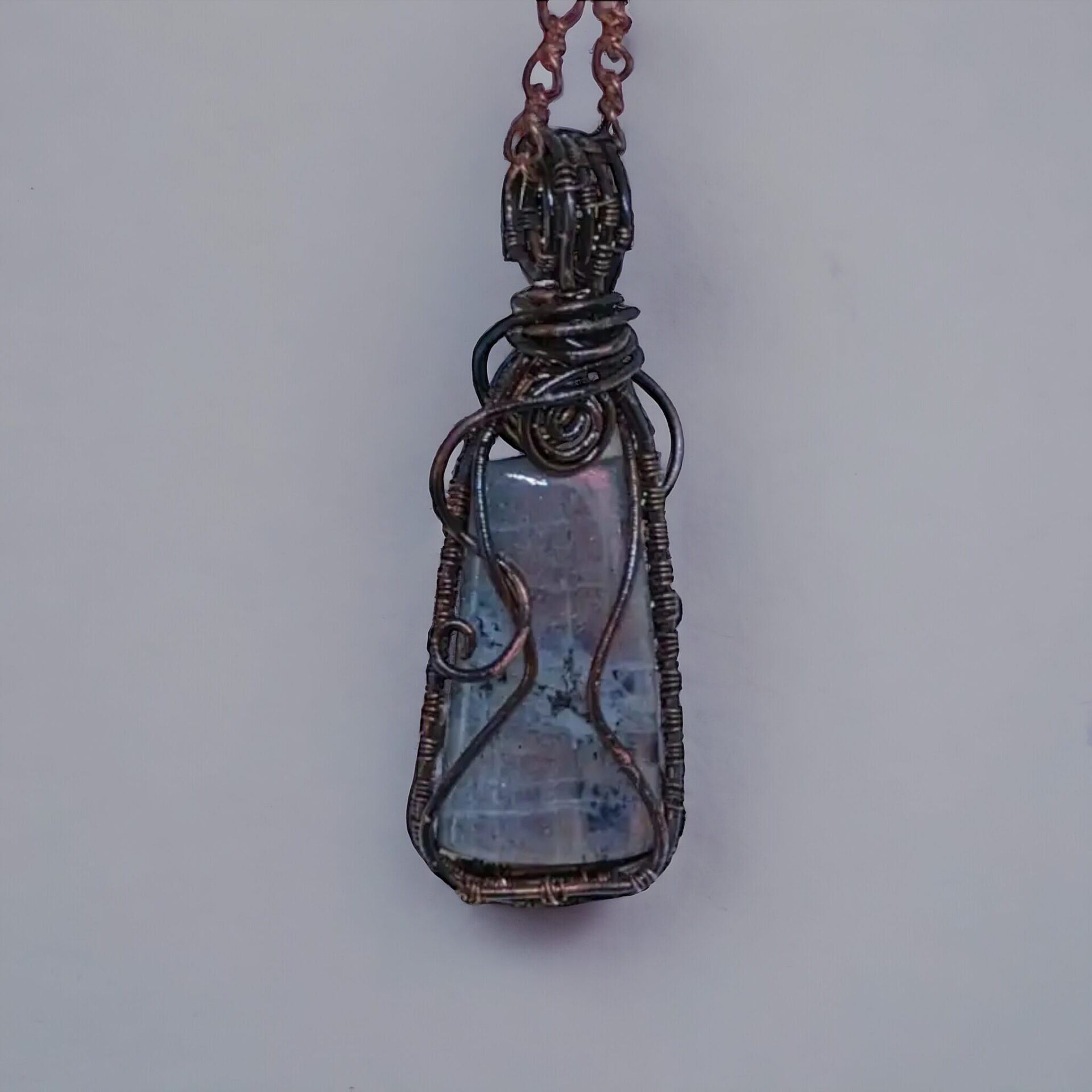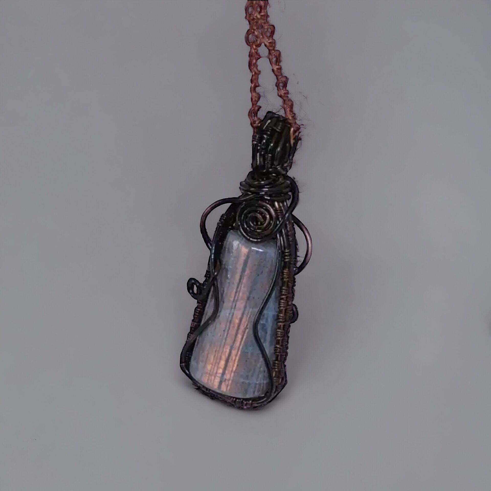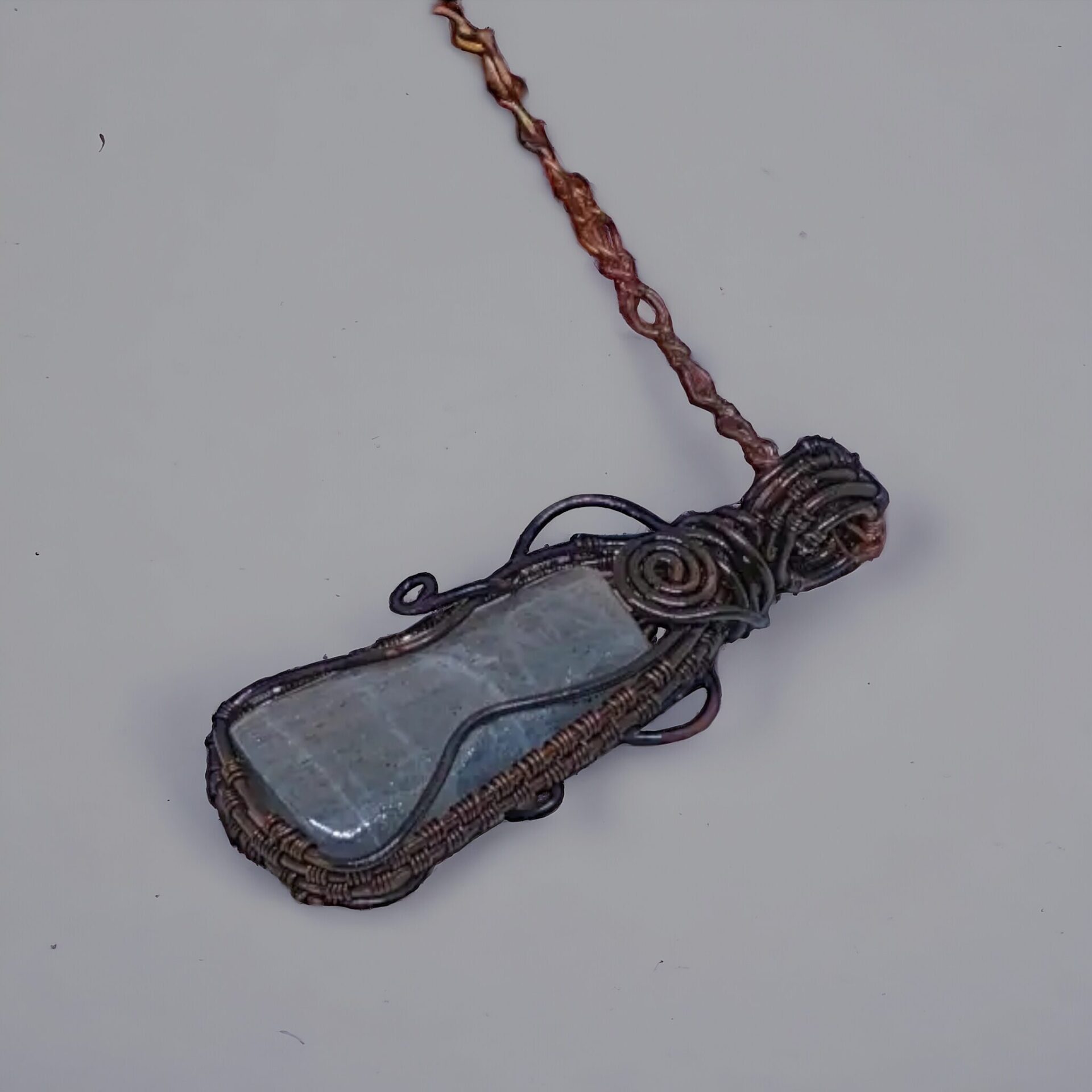 Wisiorek z Labradorytem i Miedzią – Unikalne Dzieło Sztuki Odkryj magię natury zaklętą w tym wyjątkowym wisiorku z labradorytem, wykonanym metodą wire wrapping. Ten ręcznie robiony klejnot to prawdziwe arcydzieło, które zachwyci każdego miłośnika unikalnej biżuterii. Wymiary i Materiały: Wisiorek:7 cm długości Łańcuszek:30 cm długości Materiał:Miedź Kamień:Labradoryt, znany ze swoich niesamowitych odcieni, które mienią się w świetle, tworząc spektakularne efekty optyczne. Każdy ruch ujawnia nowe, tajemnicze barwy, od głębokich błękitów po złote refleksy. Technika:Wire wrapping to technika ręcznego oplatania drutu, która pozwala na tworzenie skomplikowanych i unikalnych wzorów. Każdy wisiorek jest jedyny w swoim rodzaju, co czyni go wyjątkowym dodatkiem do Twojej kolekcji biżuterii. Styl:Ten wisiorek to idealne połączenie elegancji i naturalnego piękna. Doskonale sprawdzi się zarówno na co dzień, jak i na specjalne okazje, dodając blasku każdej stylizacji.