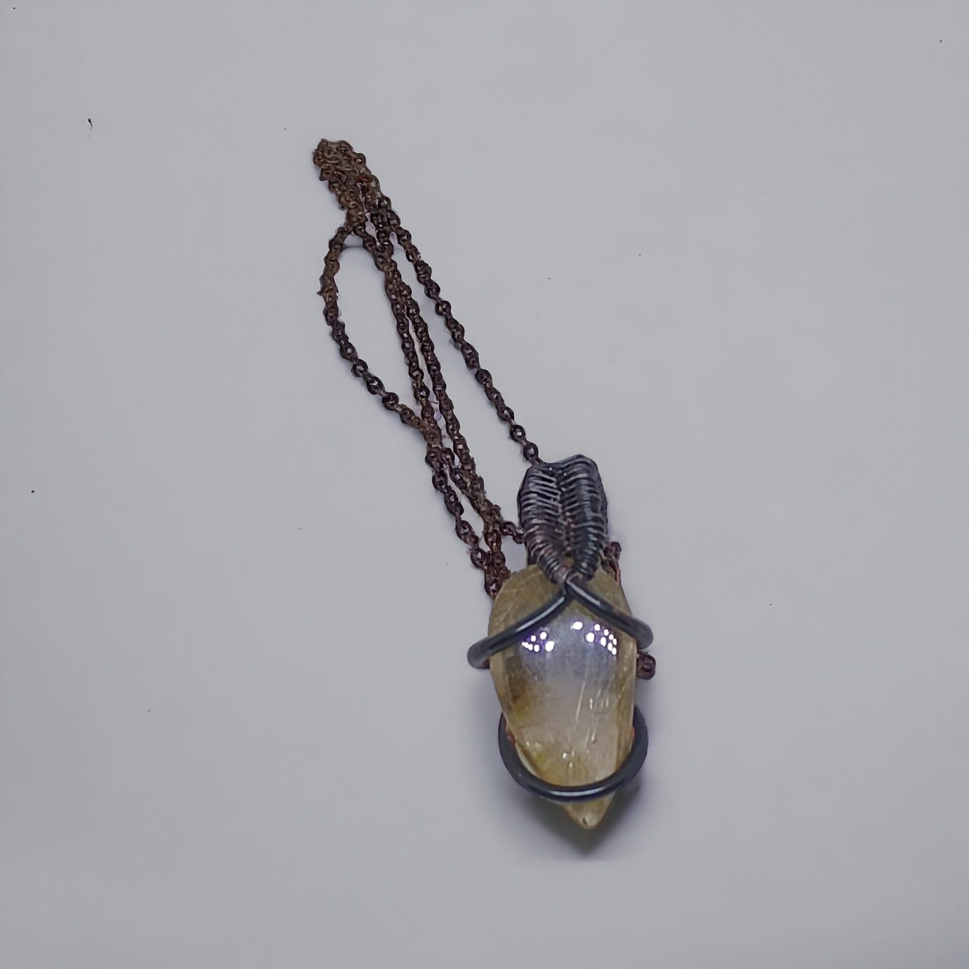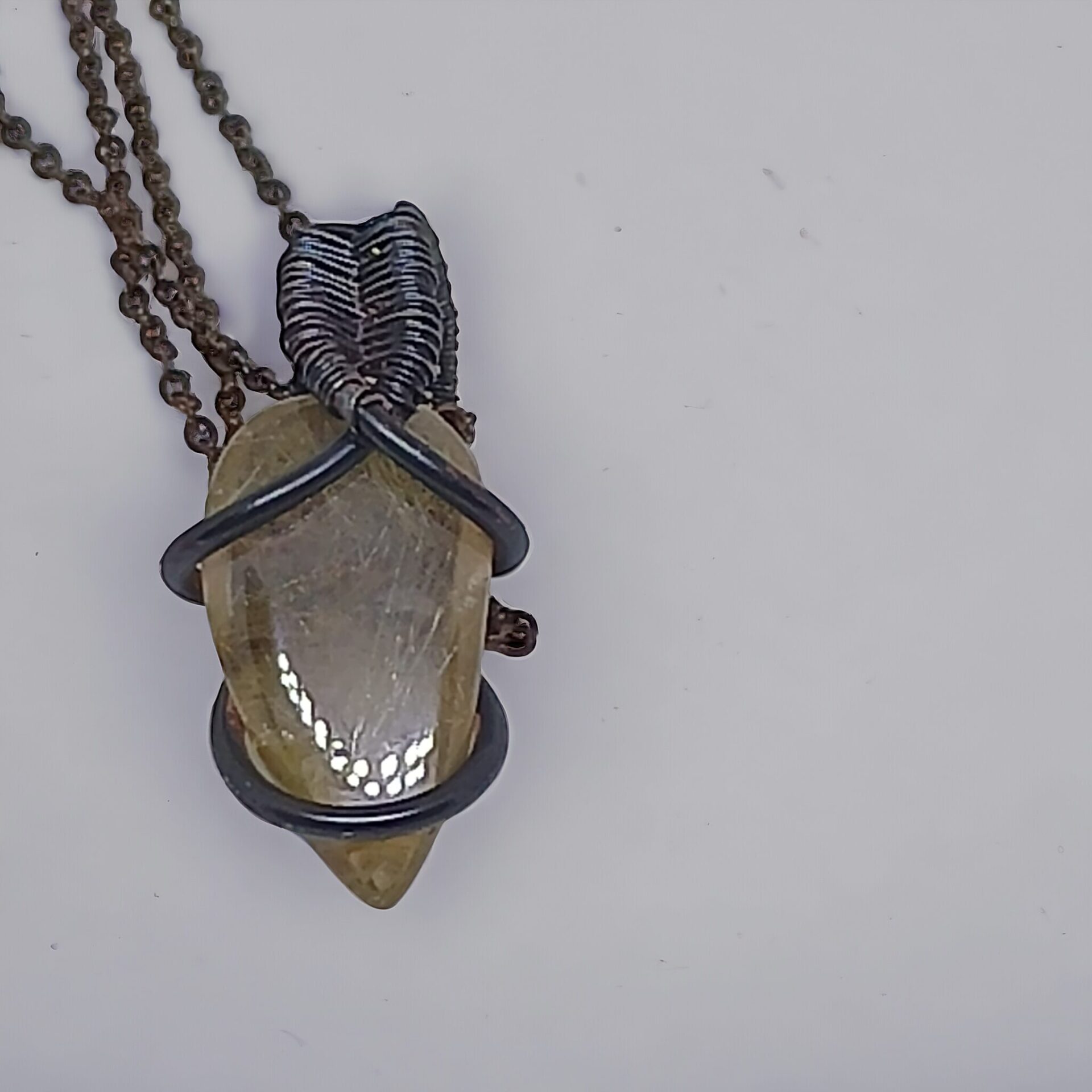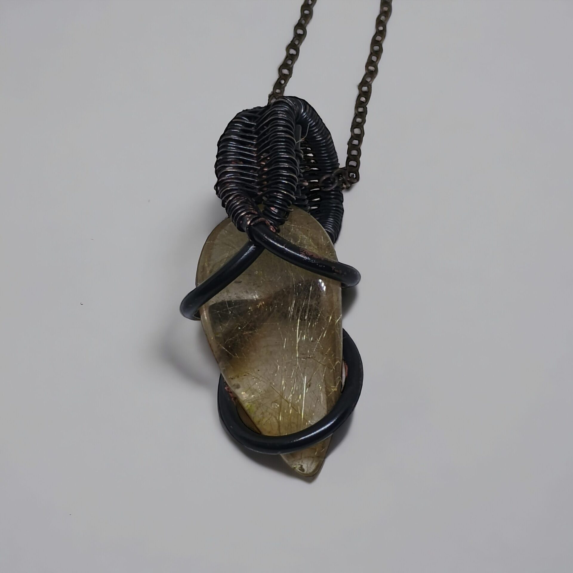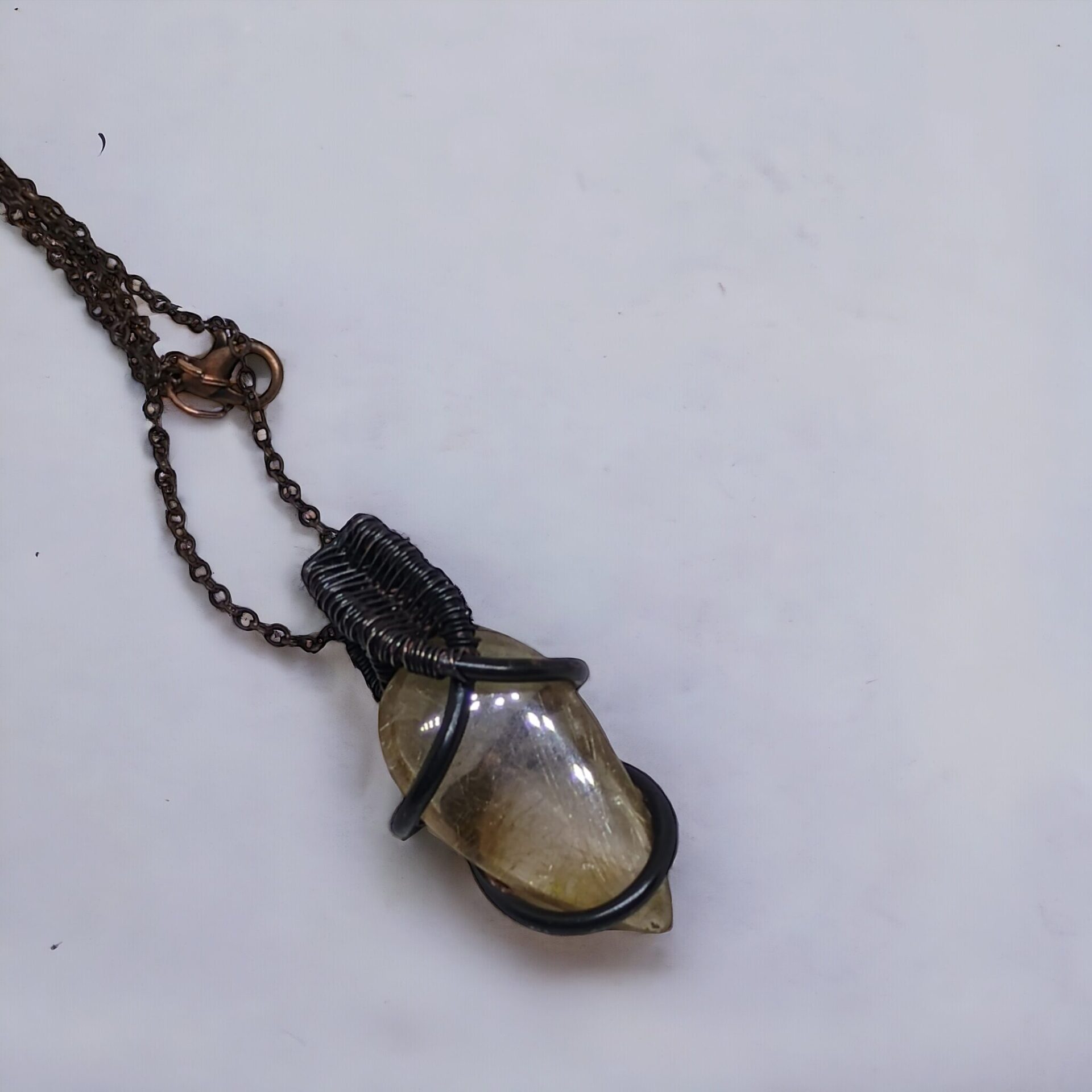 Wisiorek z Kwarcu Rutylowego posiada delikatne złote inkluzje wykonany z miedzi na łańcuszku.Pokryty oksydą w celu nadania efektu patyny.Zrobiony metodą wire wrapping.Długość wisiorka 3 cm łańcuszka 45 cm.Zamiast łańcuszka mogę dodać rzemień,jak i dopasować długość łańcuszka.