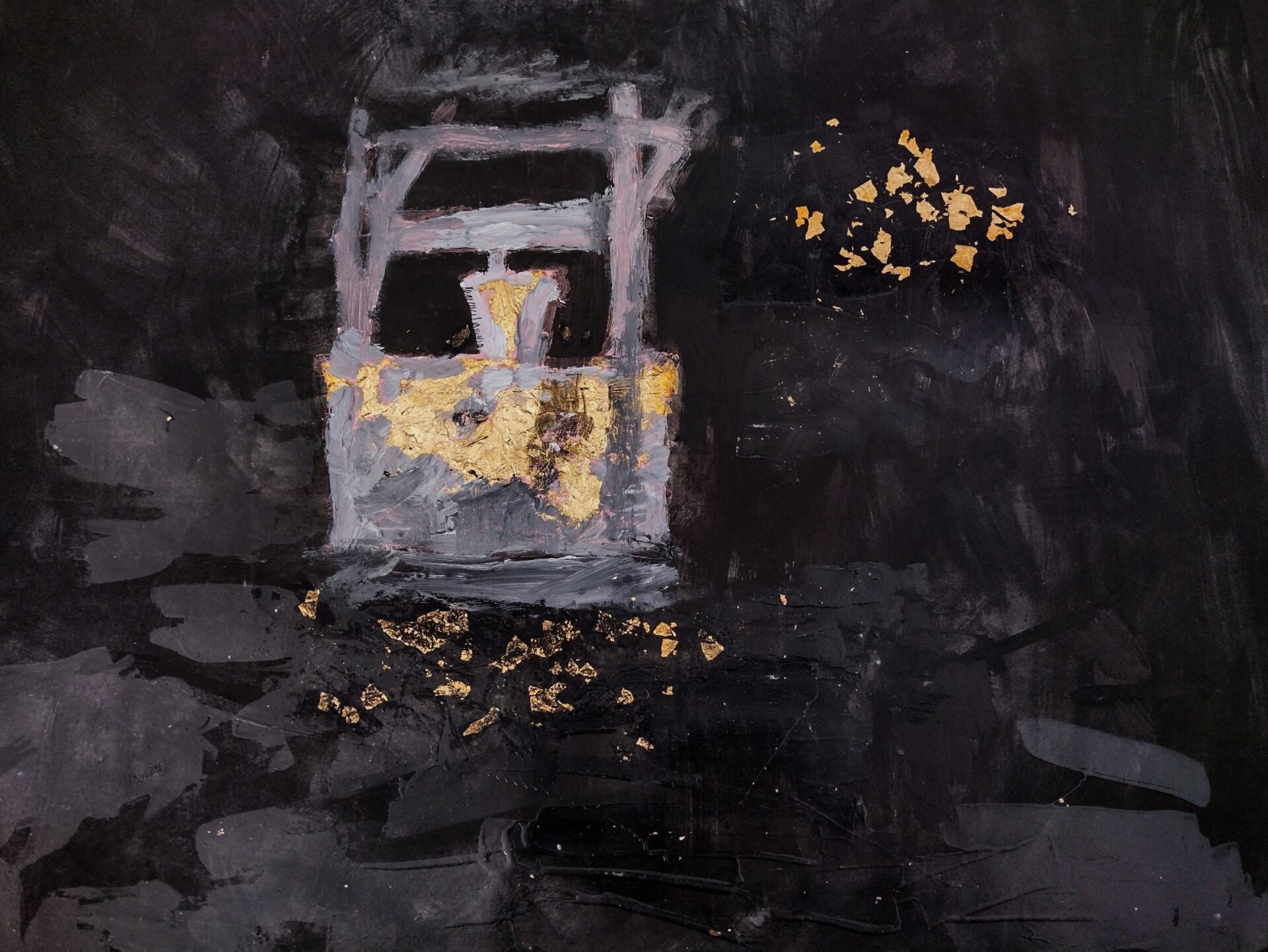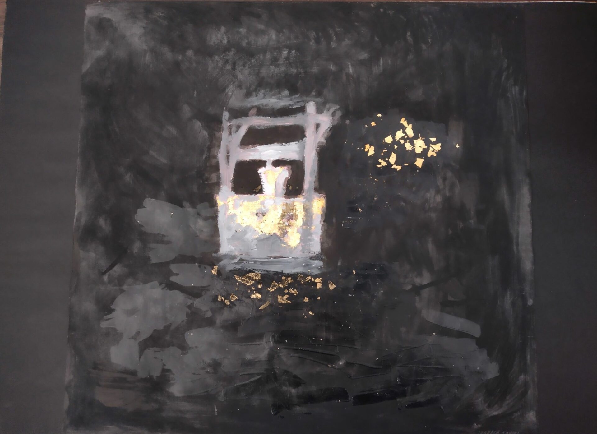 Wykonana w technice własnej praca malarska, głównie akryl, tusz, płatki złotej folii. Wymiary pracy: 52/51cm, antyrama ze szkłem: 70/50 cm