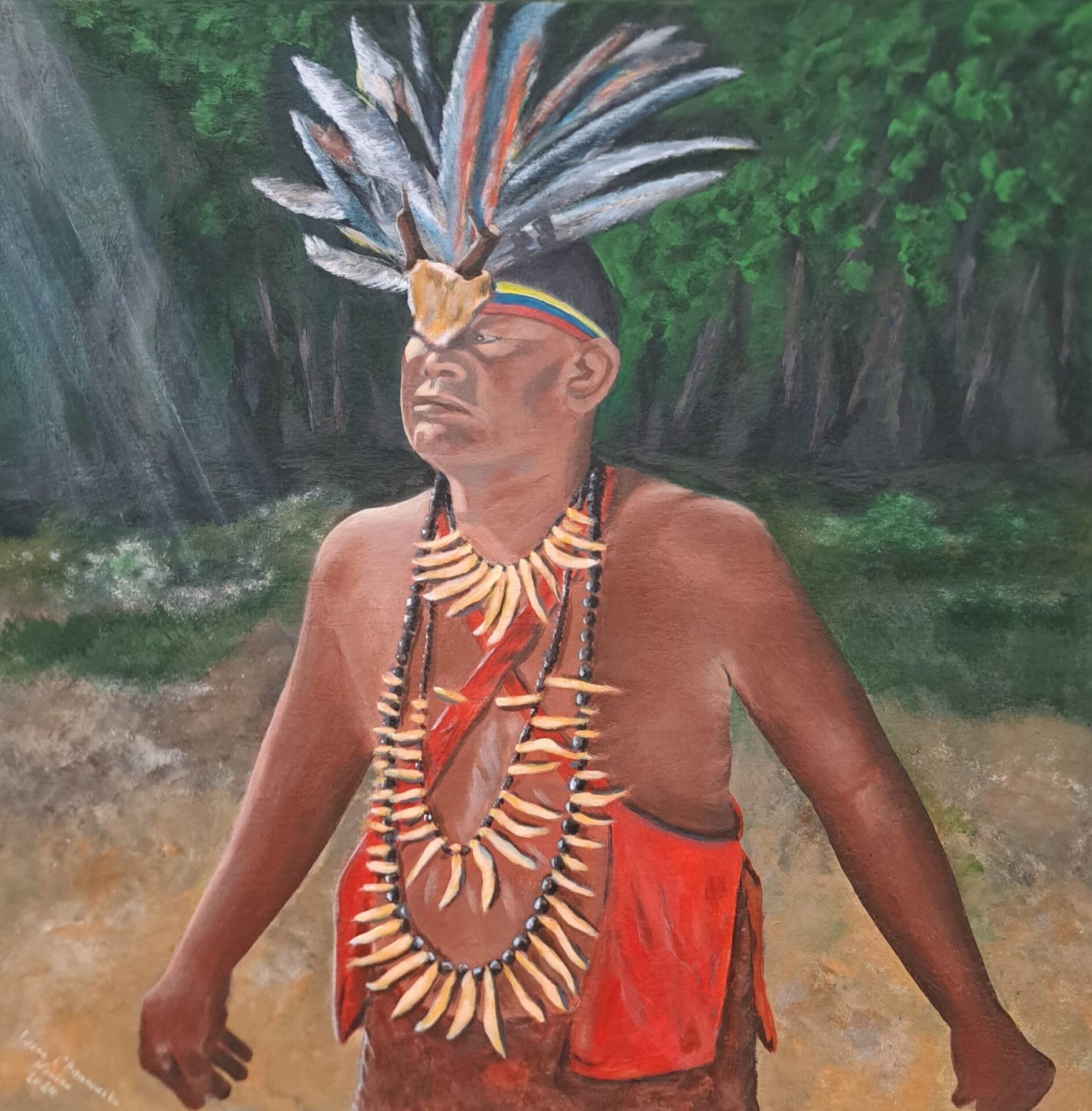 Inspiracją do namalowania tego obrazu były zdjęcia przysłane przez moją znajomą /wraz ze zgodą na namalowanie/, która spędzała wakacje w sercu dżungli w Wenezueli. Tytułowy wódz jest w moim odbiorze bardzo męski, władczy i natchniony, co potwierdzają opowieści o historii jego życia.