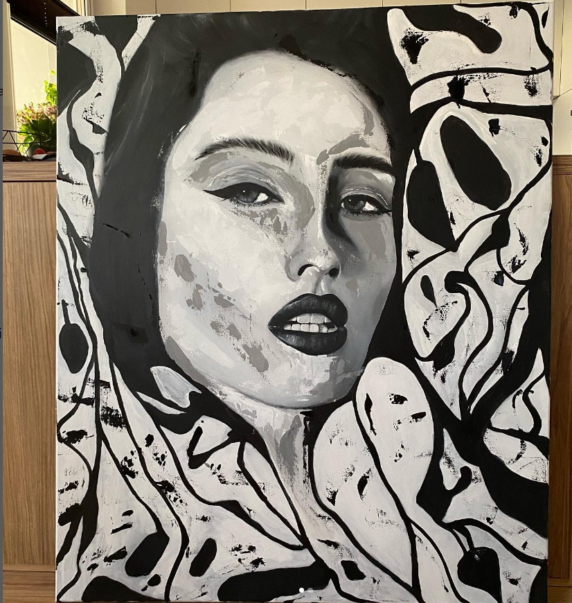 Obraz ręcznie malowany farbami akrylowymi na płótnie, kolorystyka czarno-biała.