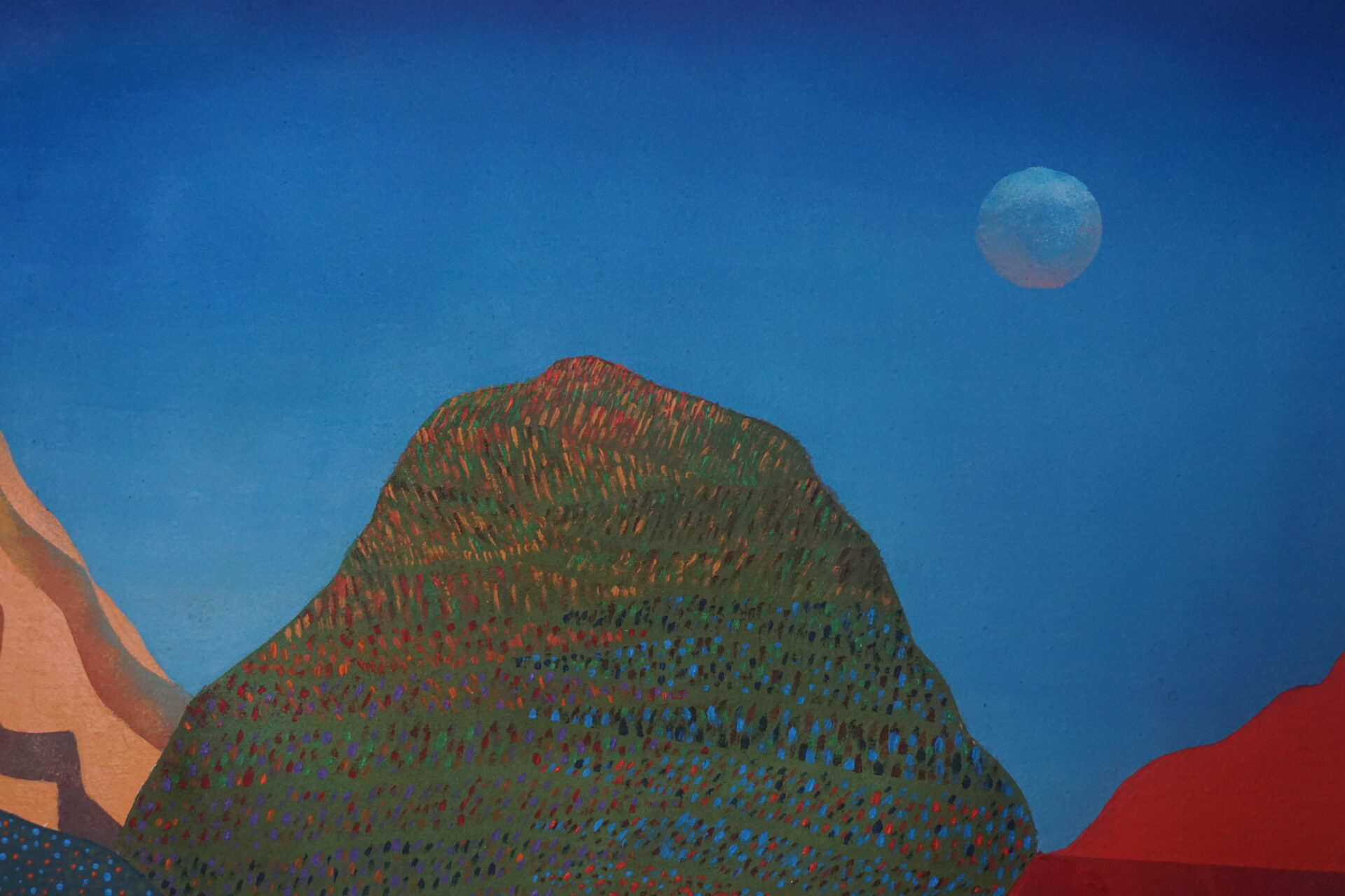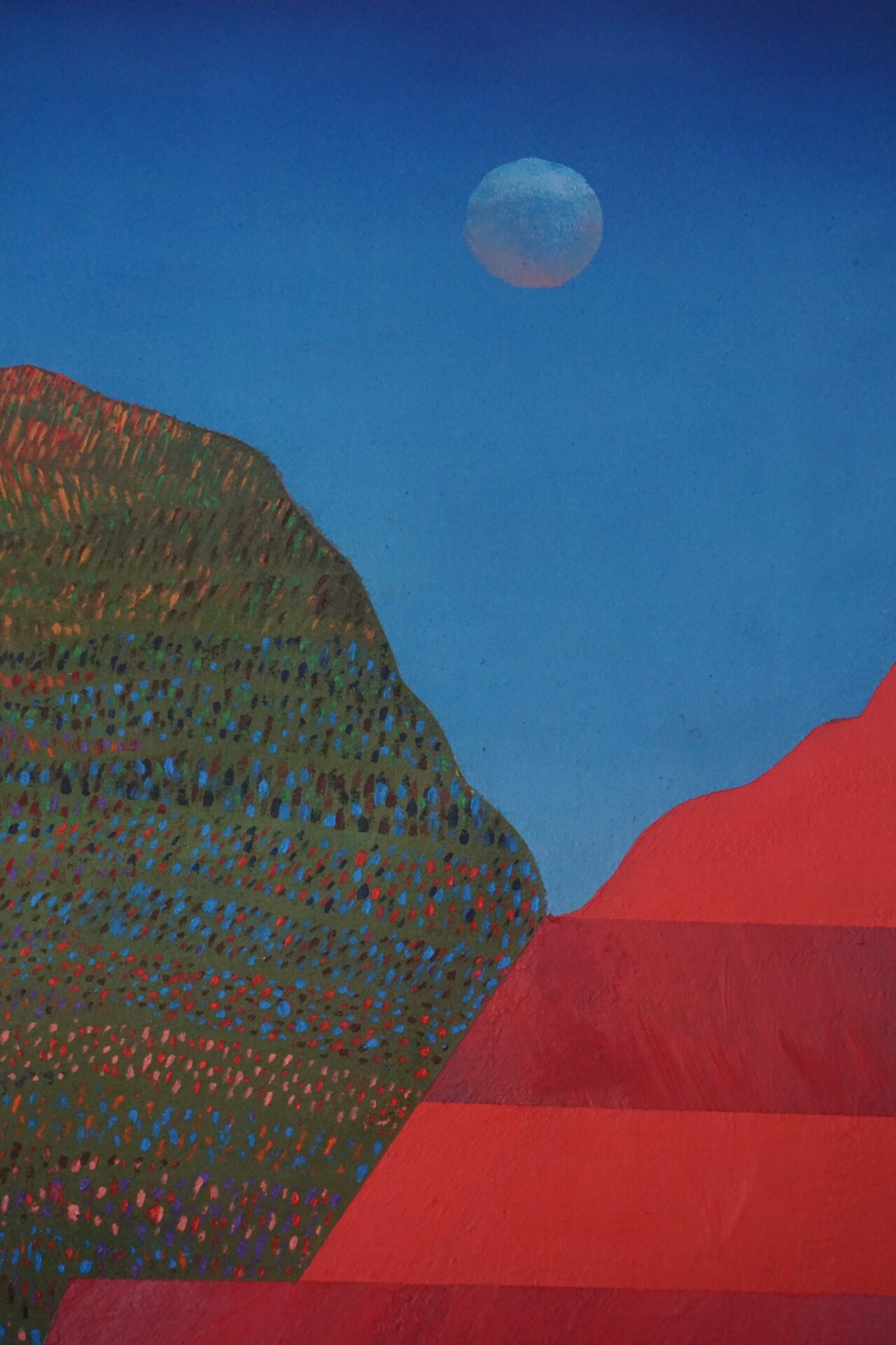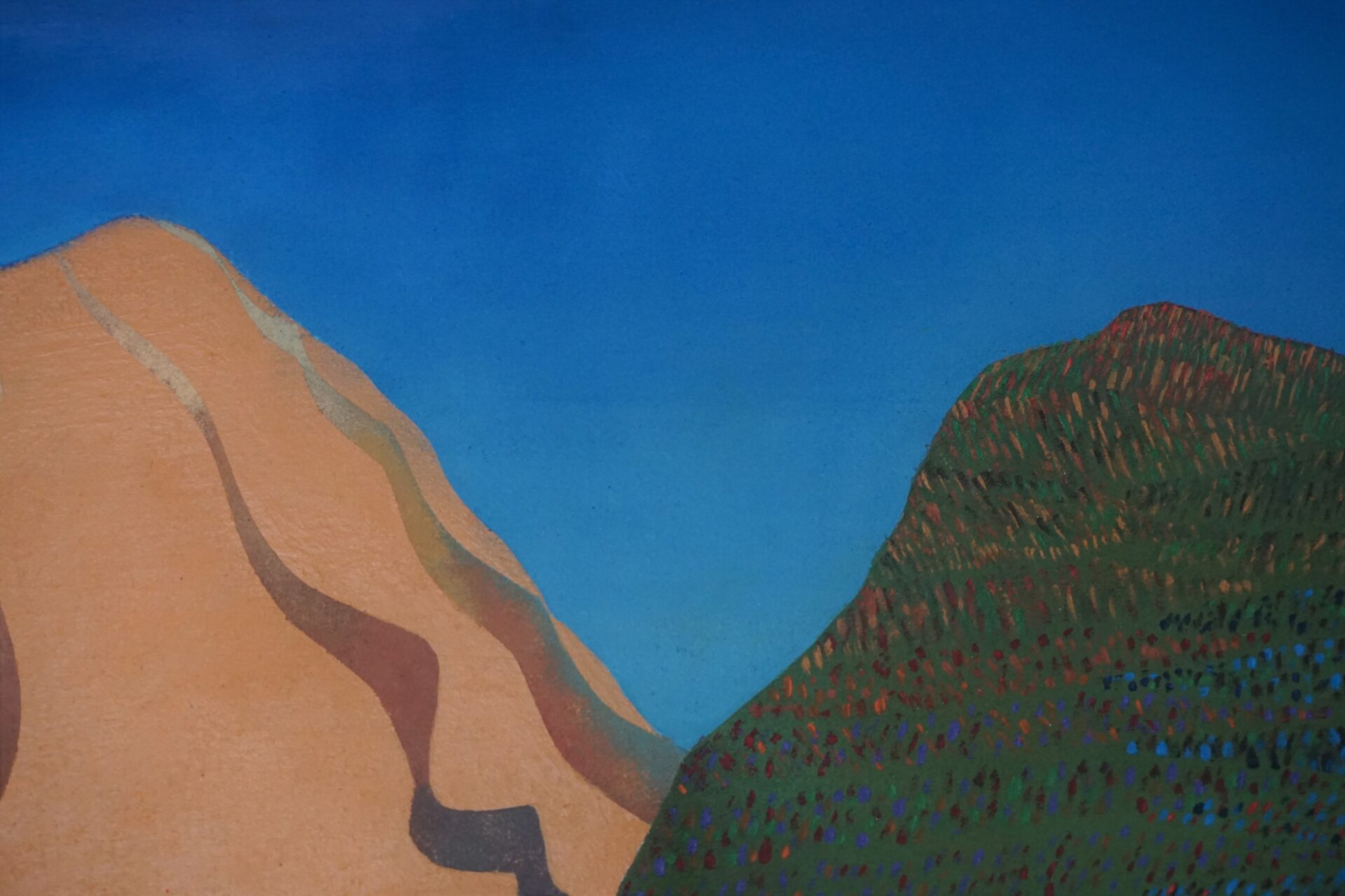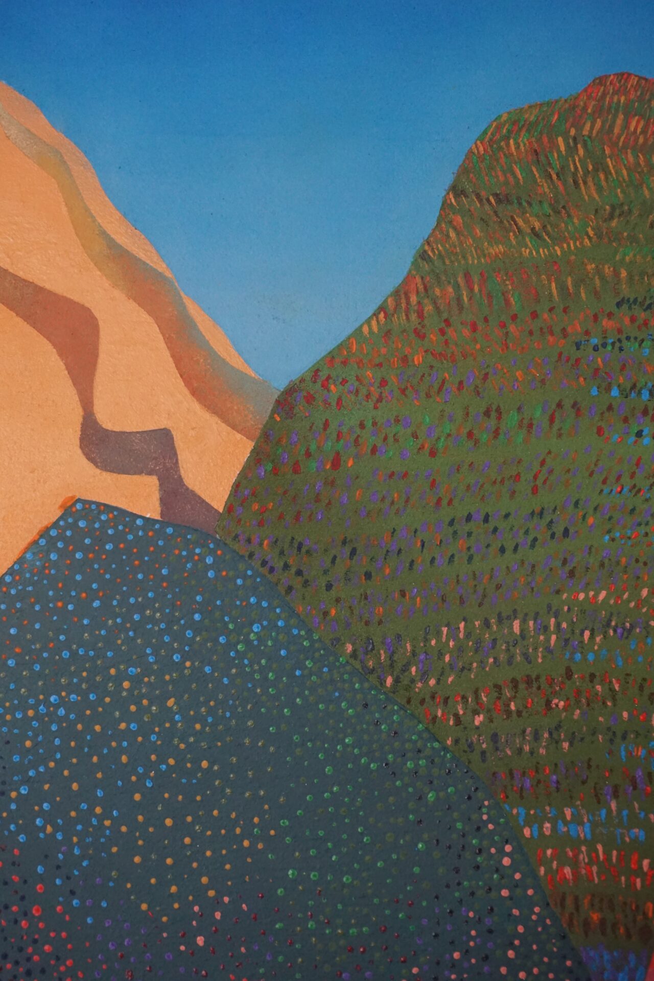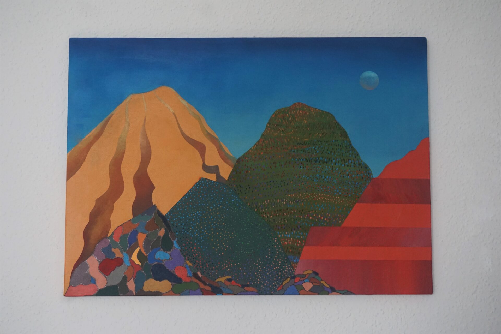 Przedstawiam Państwu kolejny obraz, który został niedawno ukończony. Praca nad nim trwała około roku i za każdym razem kiedy wracałam do niego pojawiały się nowe pomysły na jego ukończenie. Każda góra ma swój osobny charakter, jednak w razem tworzą spójną kompozycyjną całość . Inspiracją do namalowania tego obrazu były tak zwane kolorowe góry znajdujące się min w Peru, Argentynie w Chinach i innych zakątkach świata. Na ich podstawie chciałam stworzyć krainę, wyimaginowany świat, który zaprasza odbiorcę swoimi kolorami i formą, pobudza wyobraźnię oraz będzie miłym i ciekawym urozmaiceniem wnętrza.