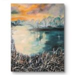 Obraz zaangażowuje od pierwszego spojrzenia. Jest pełen delikatnych, pastelowych barw, które płynnie przechodzą jedna w drugą. Chłodny błękit wody spotyka się z ciepłym pomarańczowym niebem. Na pierwszym planie widać trawy, które wyglądają, jakby poruszały się na wietrze, a ich skręcone kształty dodają dynamizmu. Kompozycja jest subtelna, nieprzytłaczająca, pozwala na chwilę zatrzymania. Styl obrazu to połączenie impresjonistycznych pociągnięć pędzla i onirycznej atmosfery. Może przywoływać wspomnienia o spokojnym poranku nad jeziorem. Albo o misternej równowadze natury. „Wow, jak to wygląda magicznie!” – mogłoby powiedzieć 7-letnie dziecko. Ten pejzaż ma coś z „dreamlike quality”. Czuję spokój, a jednak coś, jakby marzenie co chwilę ożywało na nowo. Emanuje z niego mistyczne poczucie spokoju. I ten nastrój przenika każdą z jego części. Refleksje drzew w wodzie robią wrażenie. Obraz pobudza wyobraźnię i zachęca do chwili zadumy. Idealnie oddaje ulotne piękno przyrody, zatrzymując moment, który jest poza czasem.