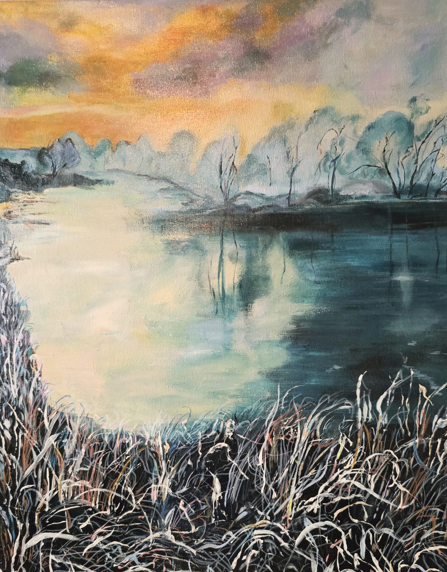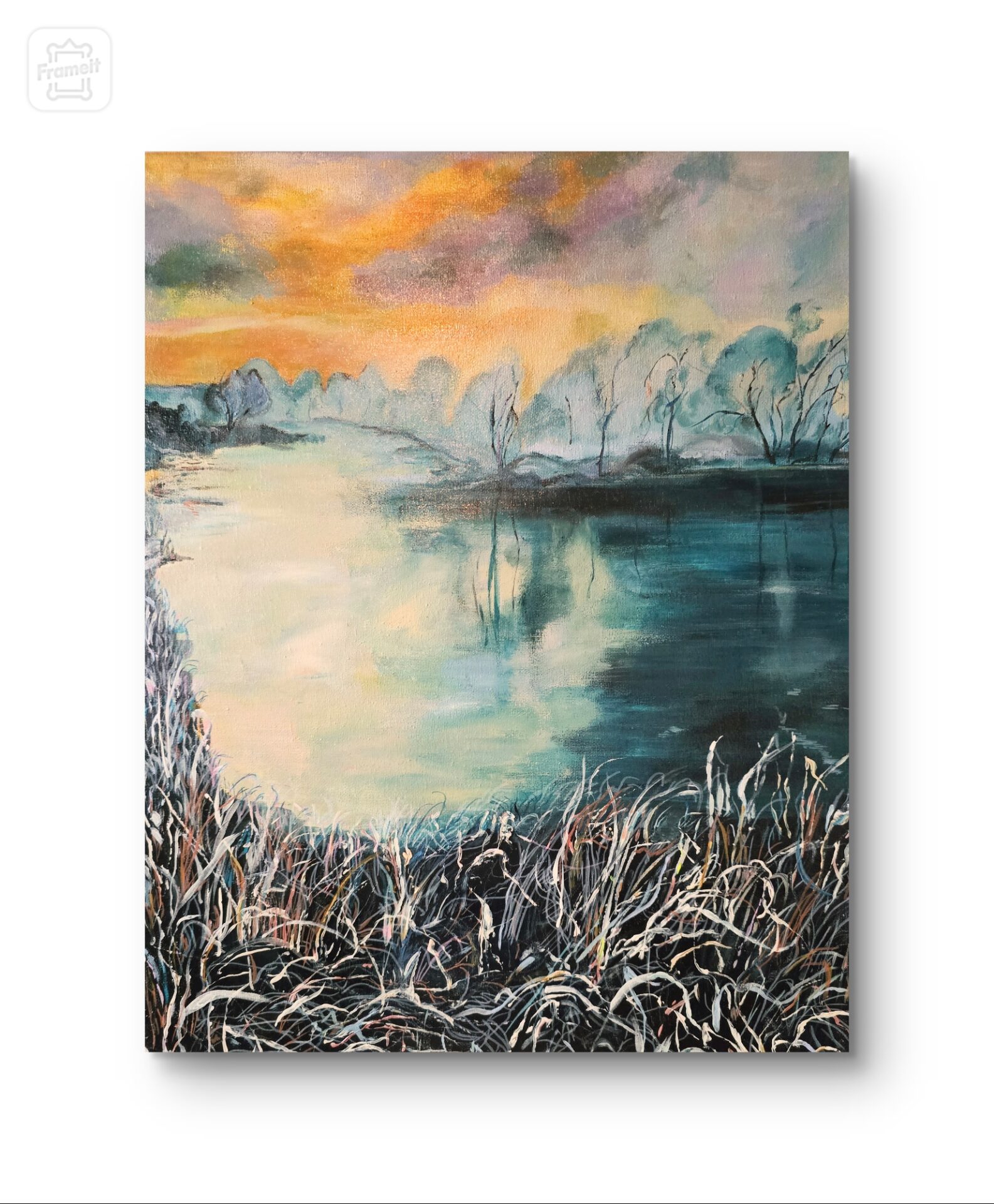 Obraz zaangażowuje od pierwszego spojrzenia. Jest pełen delikatnych, pastelowych barw, które płynnie przechodzą jedna w drugą. Chłodny błękit wody spotyka się z ciepłym pomarańczowym niebem. Na pierwszym planie widać trawy, które wyglądają, jakby poruszały się na wietrze, a ich skręcone kształty dodają dynamizmu. Kompozycja jest subtelna, nieprzytłaczająca, pozwala na chwilę zatrzymania. Styl obrazu to połączenie impresjonistycznych pociągnięć pędzla i onirycznej atmosfery. Może przywoływać wspomnienia o spokojnym poranku nad jeziorem. Albo o misternej równowadze natury. „Wow, jak to wygląda magicznie!” – mogłoby powiedzieć 7-letnie dziecko. Ten pejzaż ma coś z „dreamlike quality”. Czuję spokój, a jednak coś, jakby marzenie co chwilę ożywało na nowo. Emanuje z niego mistyczne poczucie spokoju. I ten nastrój przenika każdą z jego części. Refleksje drzew w wodzie robią wrażenie. Obraz pobudza wyobraźnię i zachęca do chwili zadumy. Idealnie oddaje ulotne piękno przyrody, zatrzymując moment, który jest poza czasem.