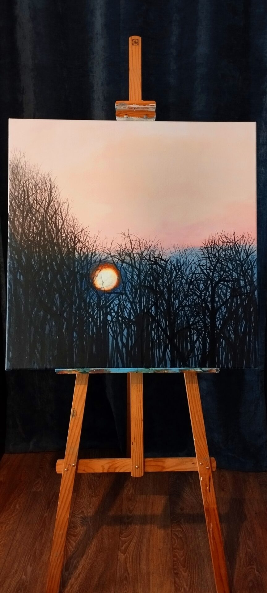 „Wschód słońca” to obraz, który powstał zimą. Kula ognia- słońce ogrzewa zmarznięte drzewa, dodając całej scenie ciepłego kolorytu. Jest ono symbolem nadziei na dobry dzień. Obraz wykonany akrylami, na płótnie 80×80