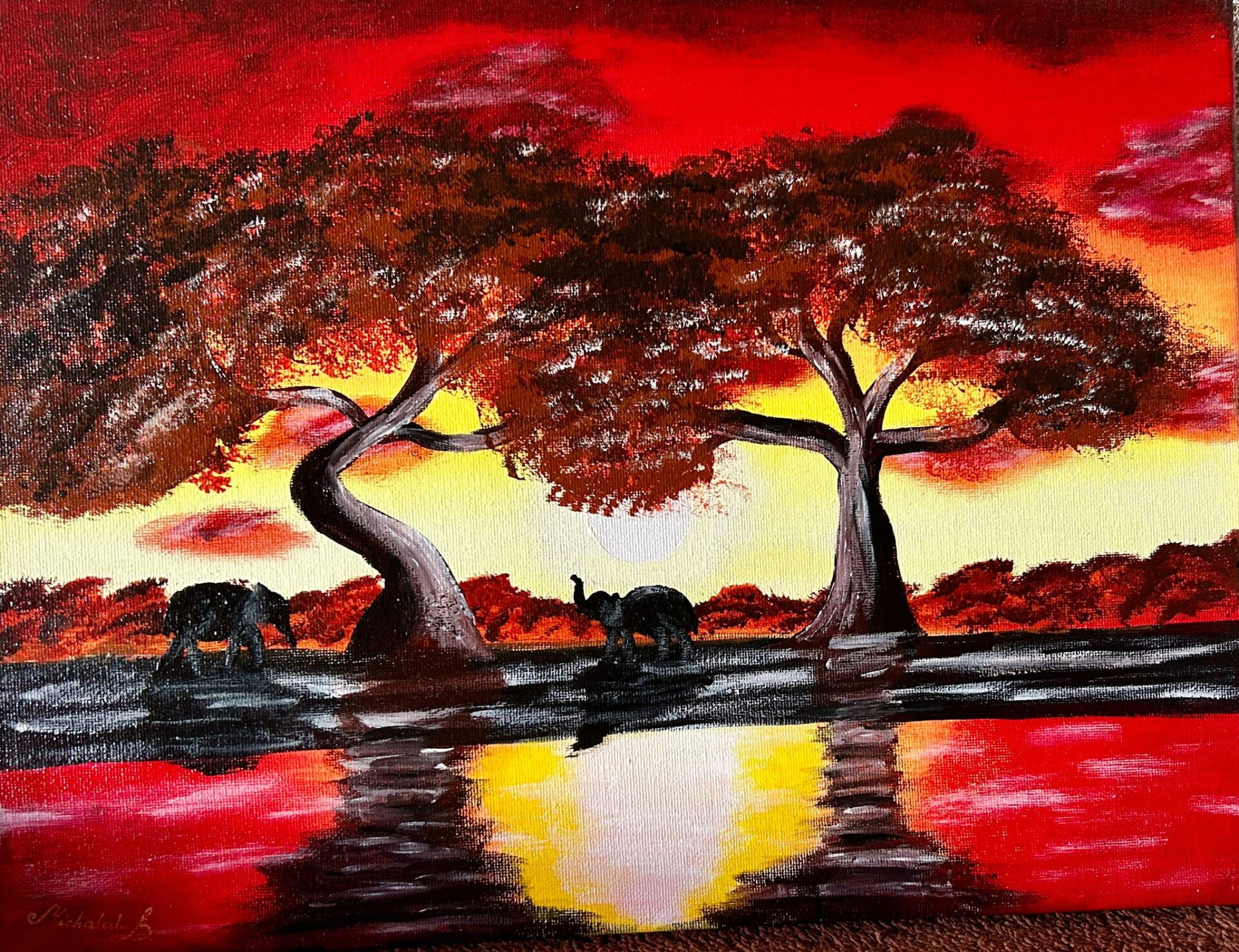 Obraz pt. „Wschodząca Afryka” , z 2023r, wymiary 40x30cm, akryl na płótnie pokryty werniksem. Serdecznie polecam.