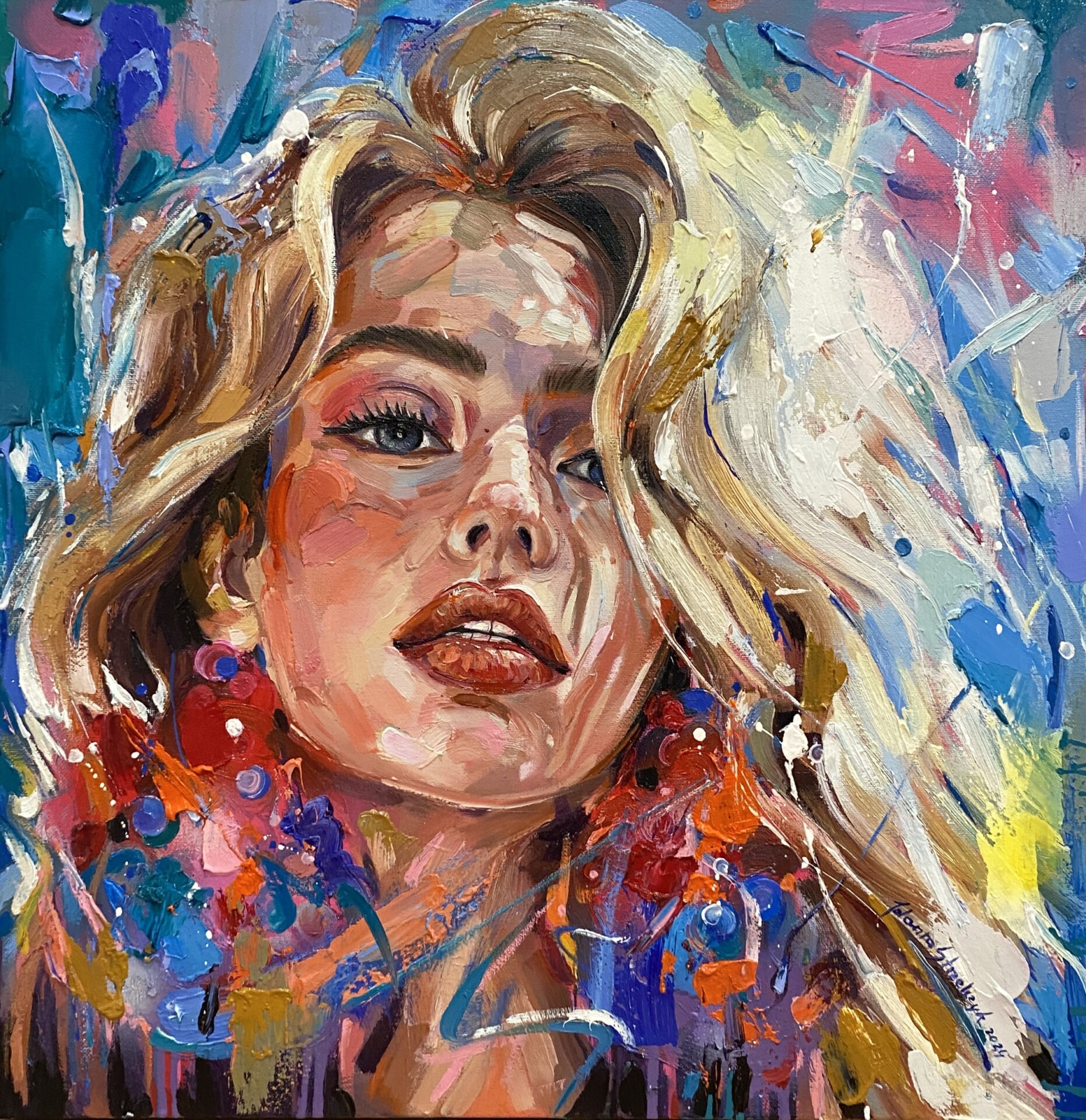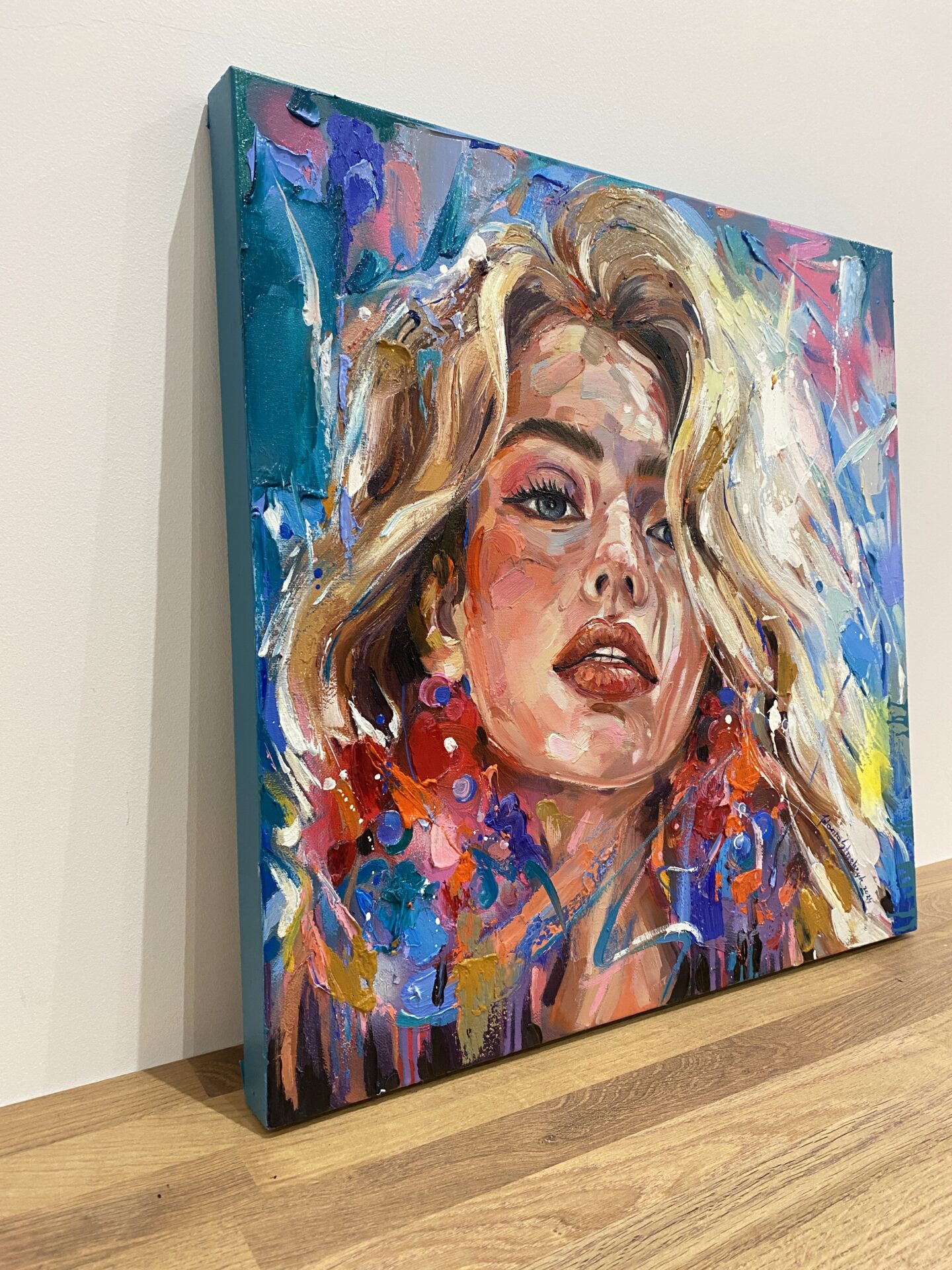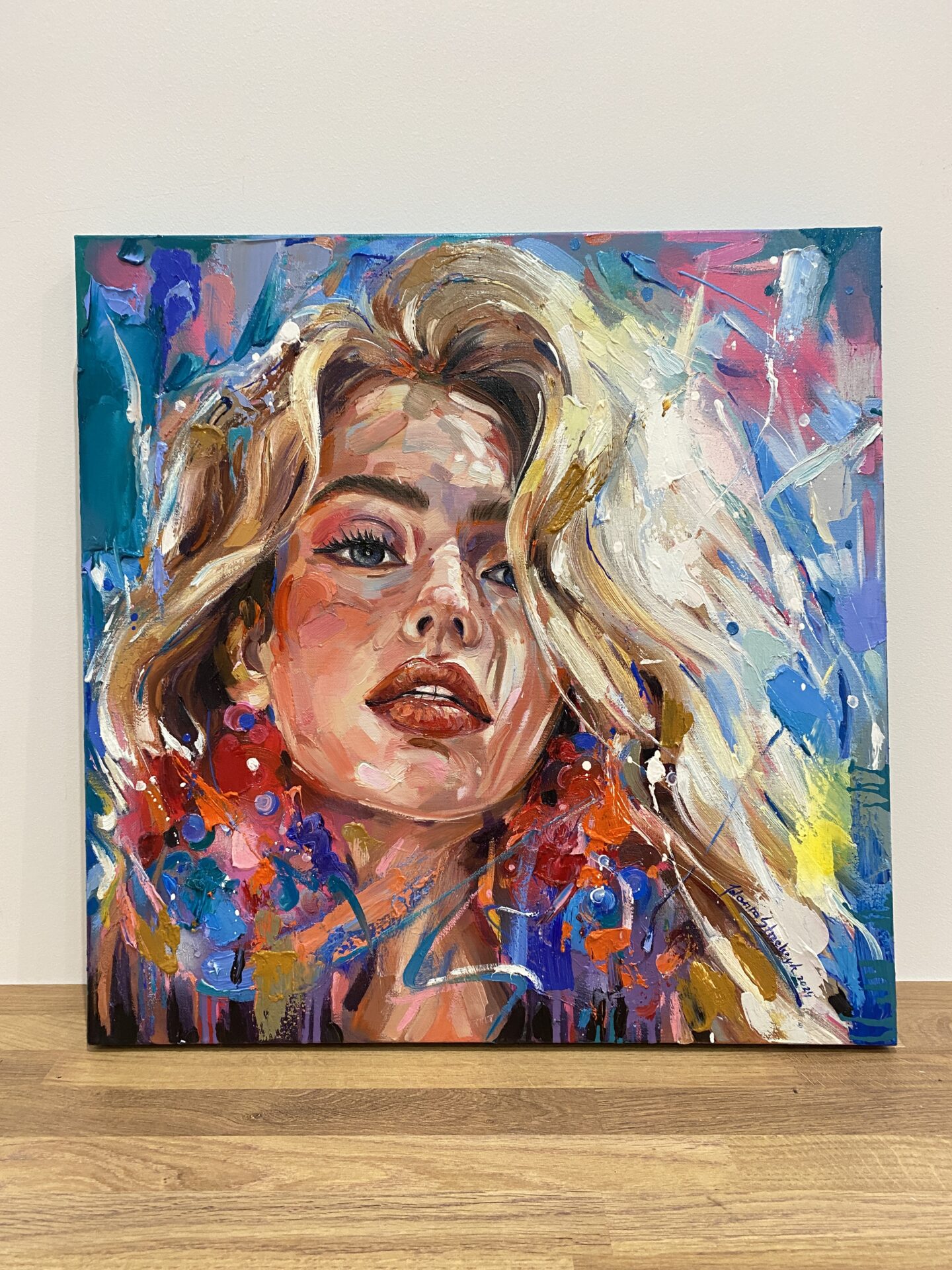 • Obraz malowany farbami olejnymi na płótnie bawełnianym o wymiarze 50x50x3cm, rok wykonania 2024.