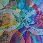 Abstrakcyjne wielobarwne dzieło. Przedstawione przeplatające się wzajemnie serpentyny/ wstęgi oraz pętla nieskończoności.