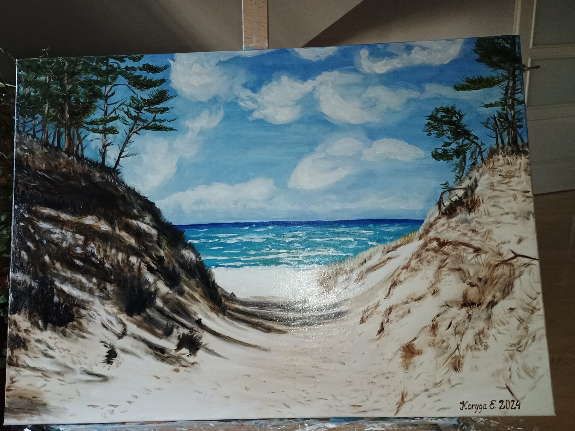 Obraz przedstawia wydmy w miejscowości Pustkowo nad Bałtykiem. Malowany jest farbami olejnymi Van Gogh i zabezpieczony werniksem.