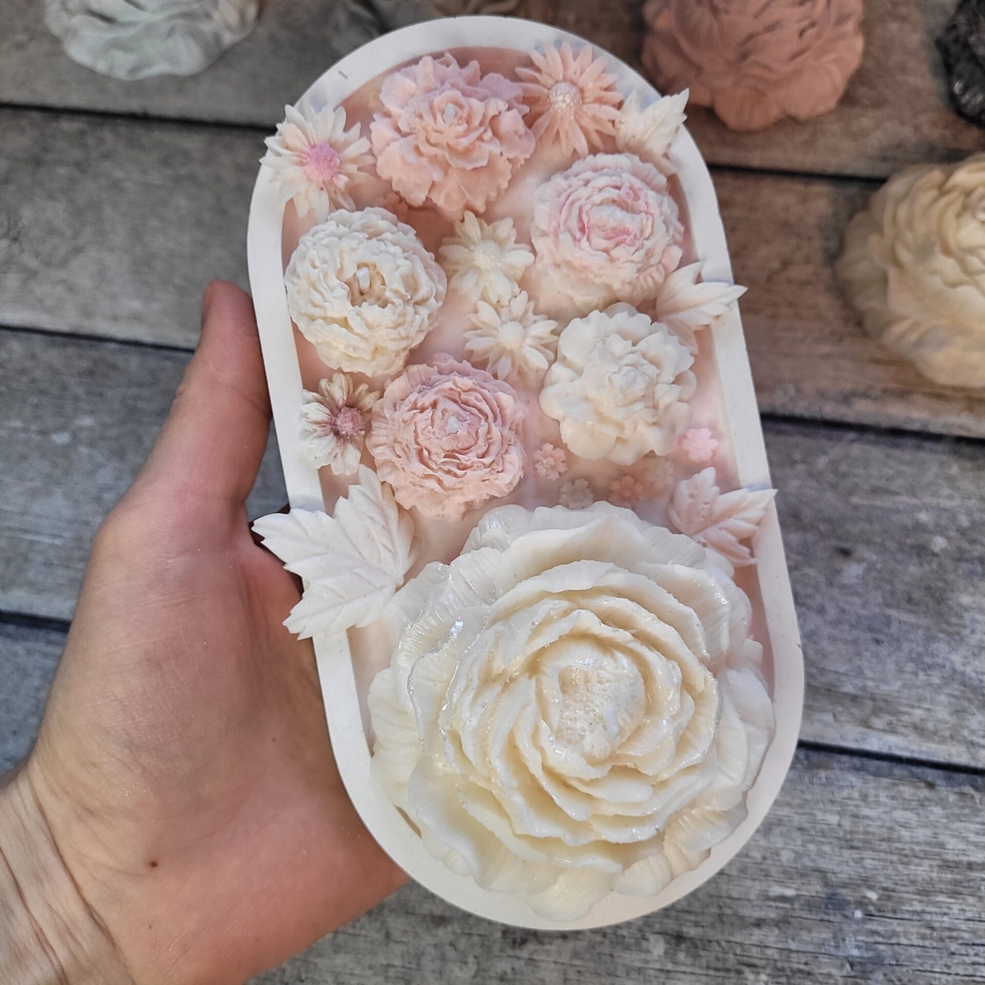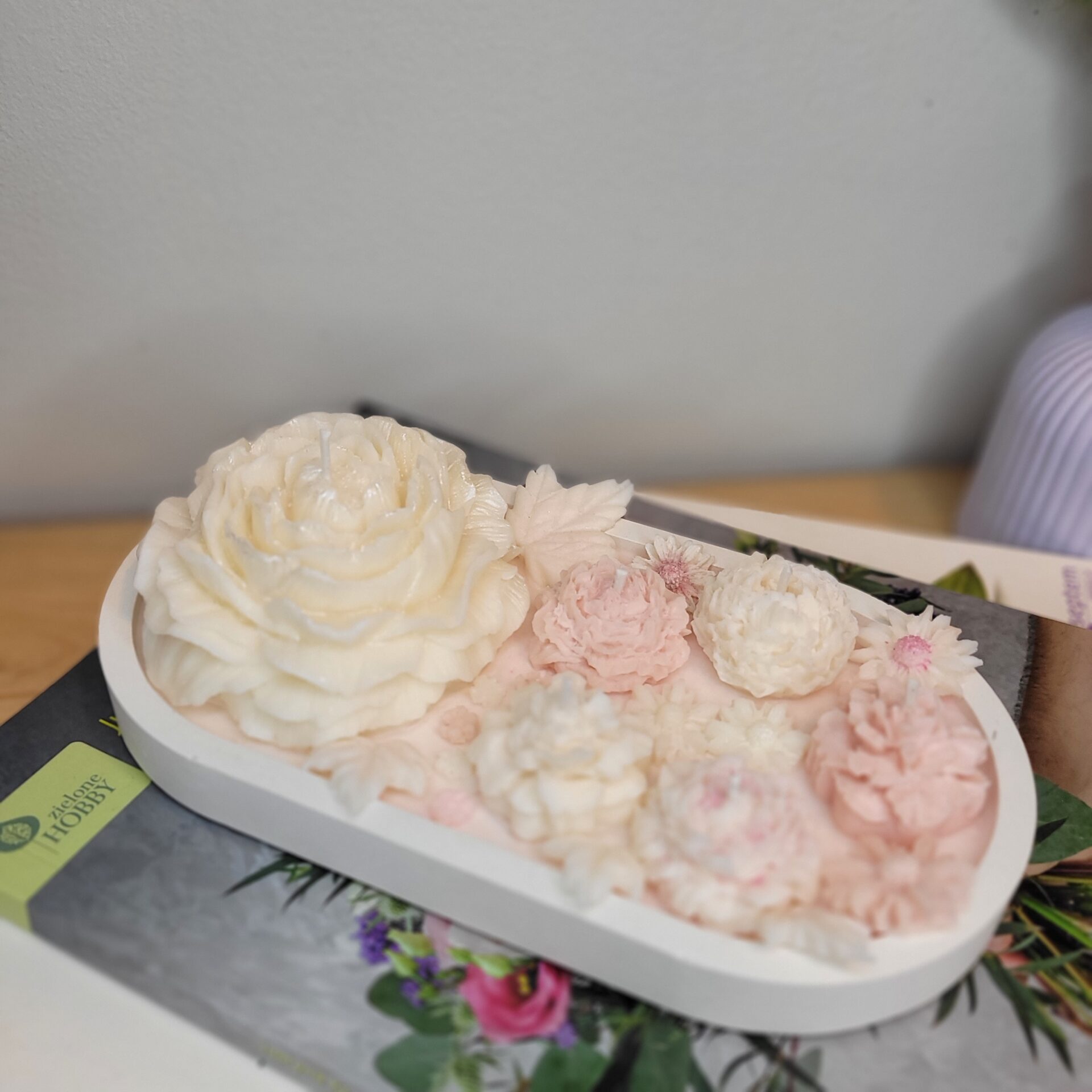 Wyjątkowy zestaw świec sojowych wykonanych ręcznie z miłością i dbałością o szczegóły. Głównym elementem kompozycji jest duża świeca w kształcie piwonii, symbol delikatności i wyrafinowanego piękna. Wyjątkowy zapach, subtelny design i gipsowa podstawka sprawiają, że ten zestaw to nie tylko praktyczny, ale i stylowy element dekoracyjny. Każda świeca to małe dzieło sztuki, które wypełni Twój dom ciepłem i przytulnością. Idealny prezent dla tych, którzy cenią piękno i indywidualność!Podstawka ma wymiary 18,5*9,5 cm