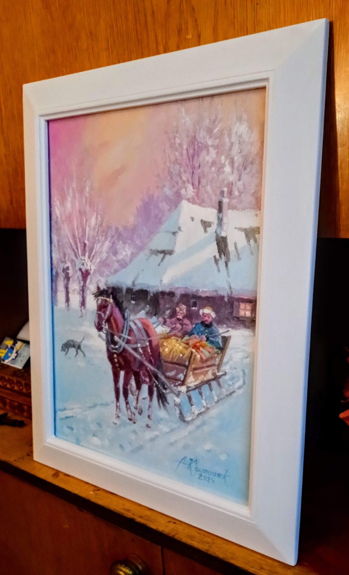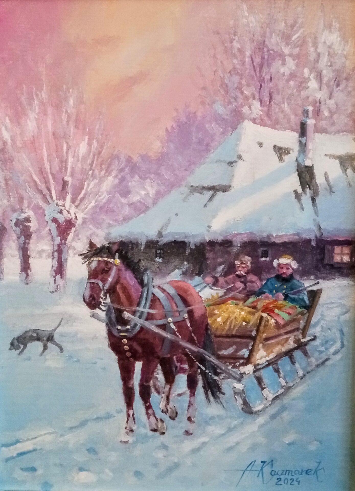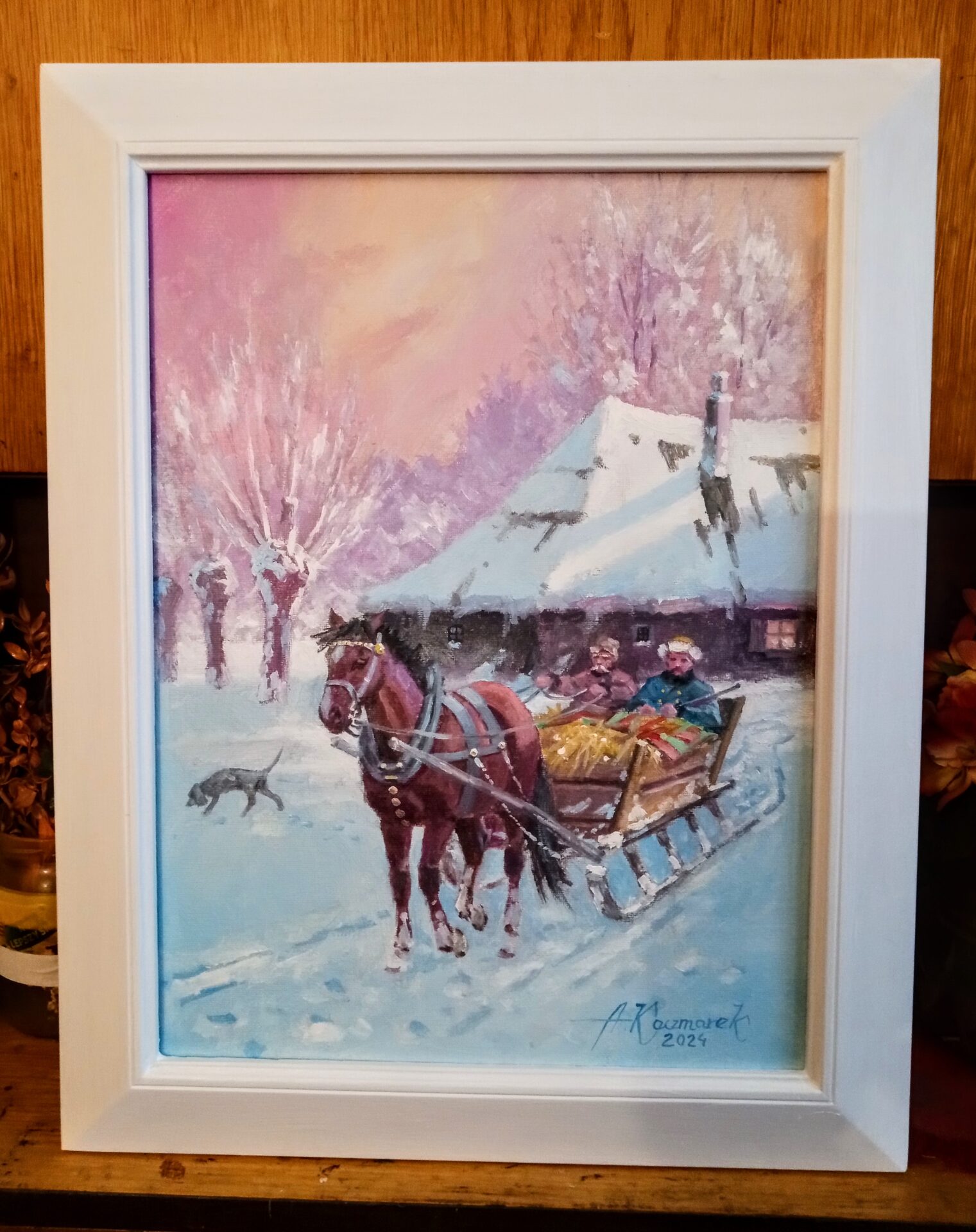 OBRAZ OLEJNY NA PŁÓTNIE.WYMIRY Z RAMĄ 50X40.OBRAZ PRZEDSTAWIA PIĘKNĄ,POLSKĄ ZIMĘ W DAWNYCH, ODLEGŁYCH CZASACH…