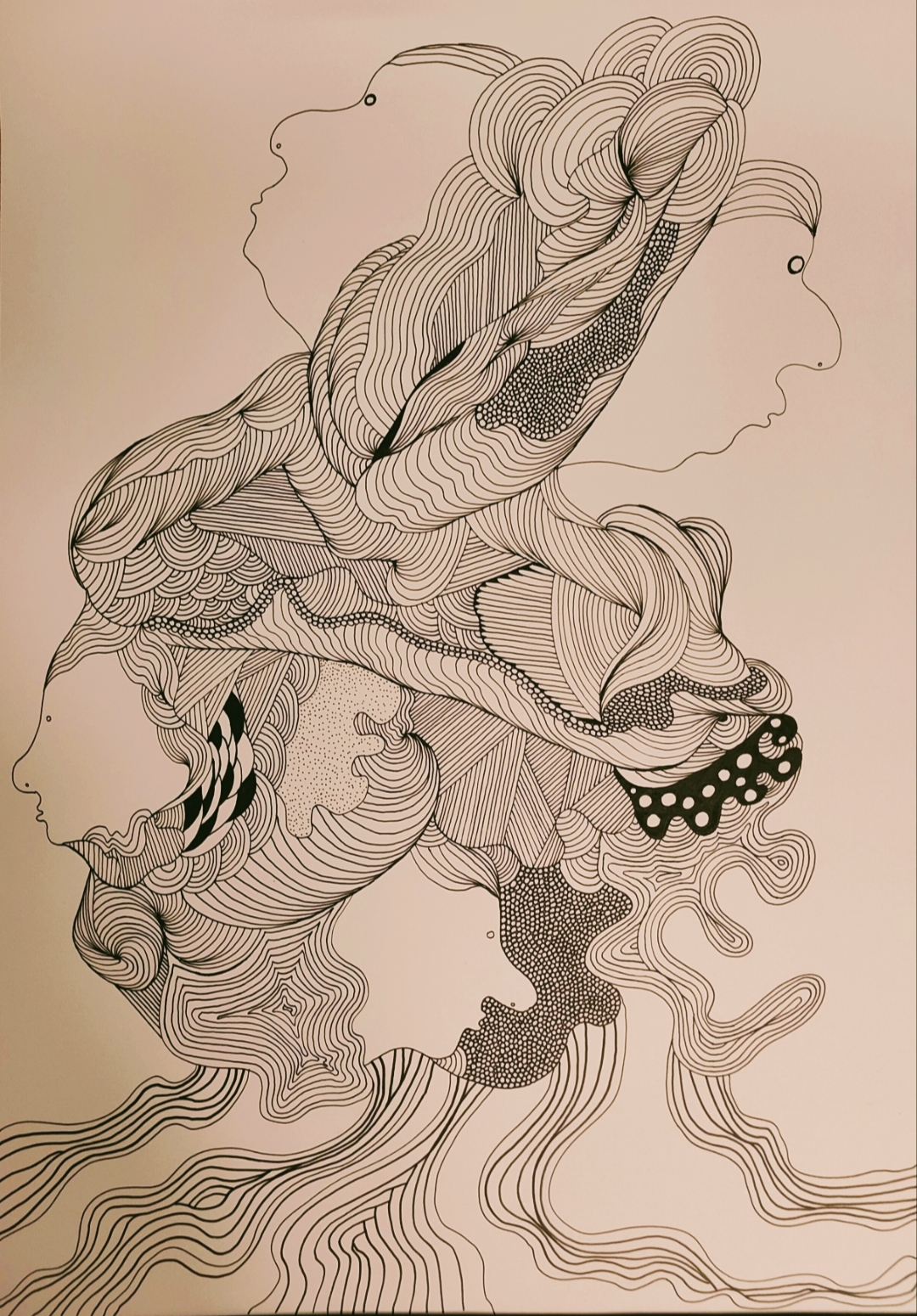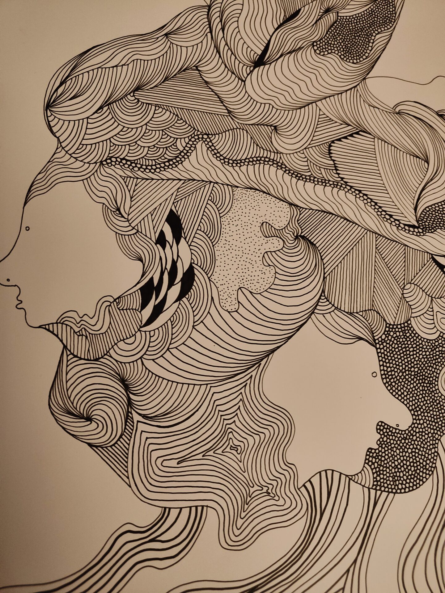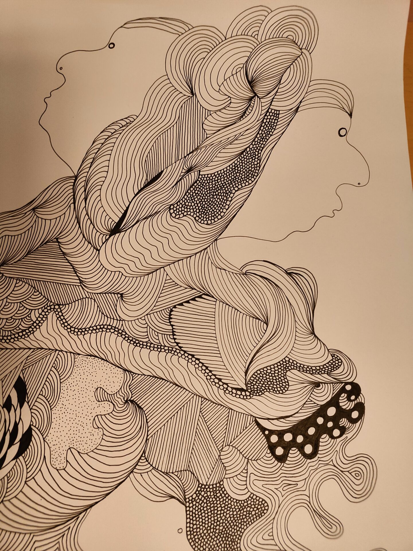 Obraz wykonany czarnym cienkopisem grubości 0,05 cm. Rysunek intuicyjny, metodą Zentangle. Papier biały. Cienkopis wodoodporny. Rozmiar obrazu 59,4 cm x 42 cm.