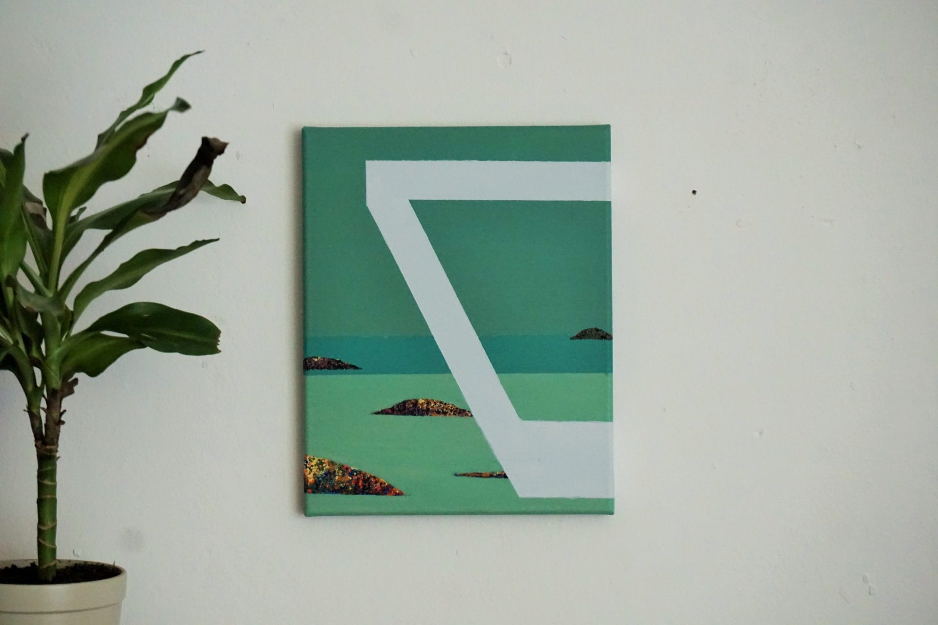 Współczesna kompozycja abstrakcji geometrycznej, przedstawiająca geometryczną konstrukcje na tle wysepek śmieci. Obraz idealnie pasuje do wnętrz domu jak i biur.