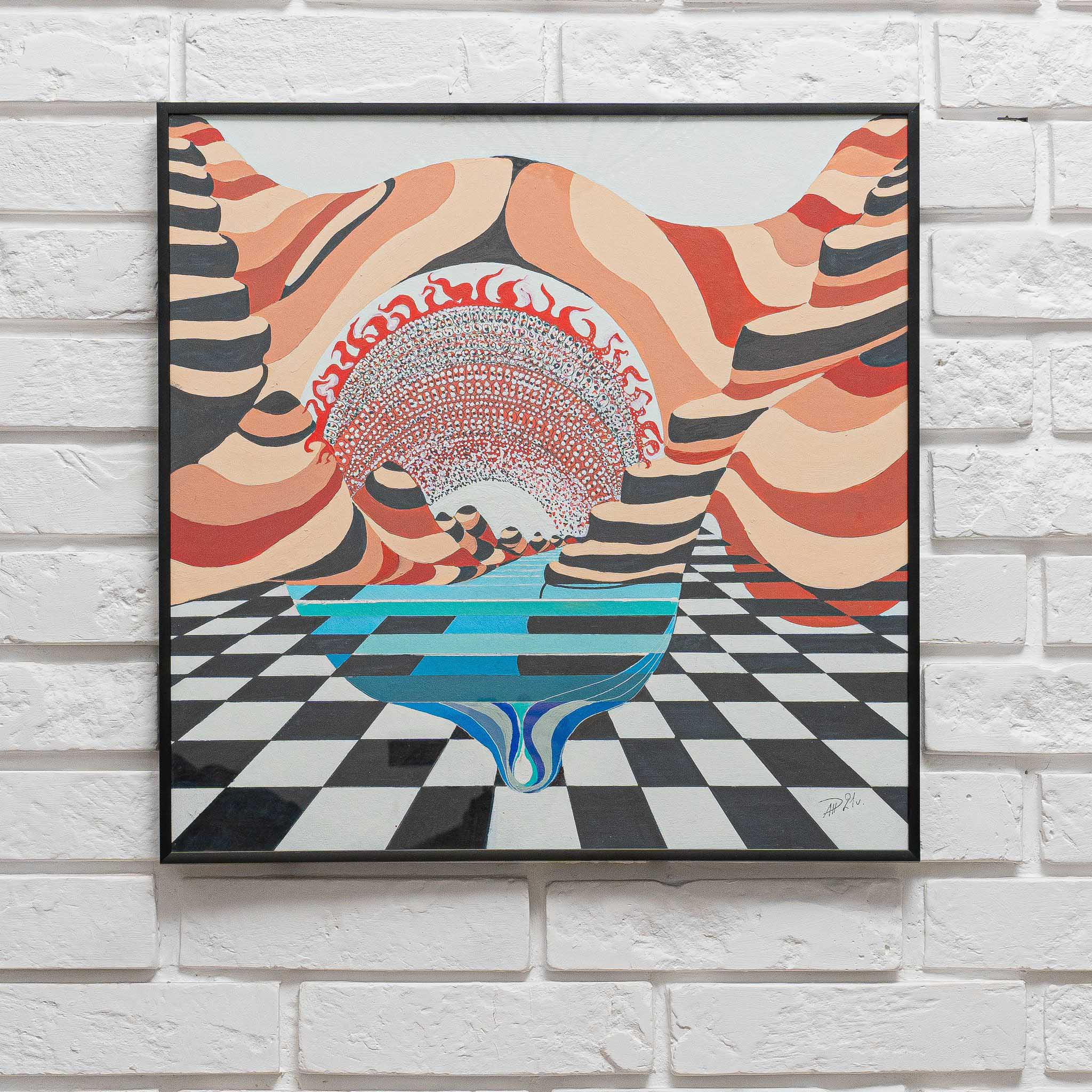 Podłoże obrazu to szachownica w czarno-białe kwadraty, która nadaje kompozycji dynamiczny rytm i głębię. To tło przypomina planszę gry, gdzie każda decyzja prowadzi do nowego odkrycia, a każdy krok jest ważny w podróży przez ten surrealistyczny krajobraz.