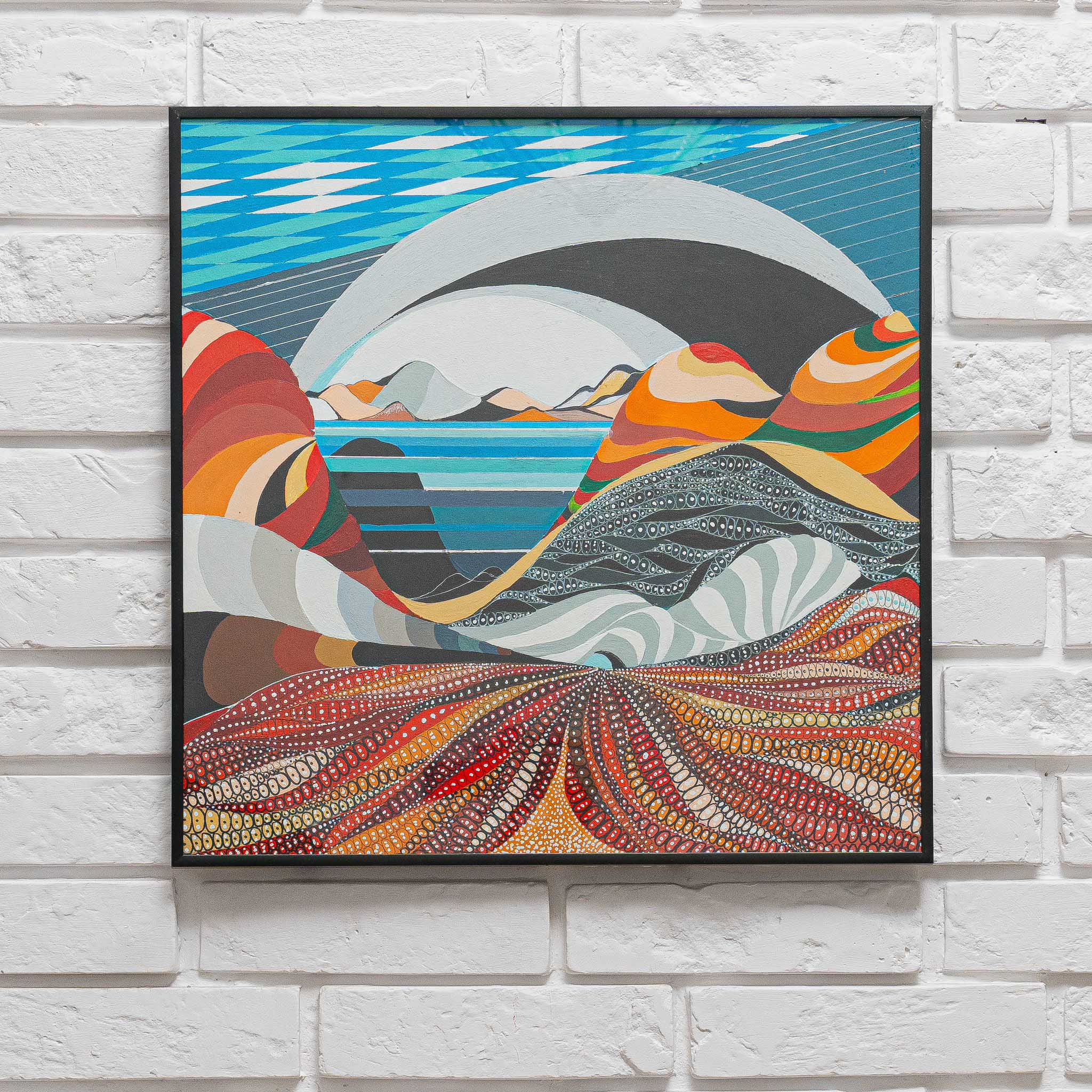 W centralnej części obrazu dominują łagodne, falujące wzgórza, pokryte intensywnymi, kontrastującymi barwami – od odcieni czerwieni i pomarańczu po zielenie, błękity i szarości. Te wzgórza, jakby utkane z wielu wątków, symbolizują różnorodność doświadczeń i miejsc, które zostały odkryte i poznane.