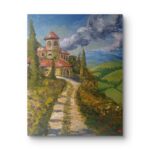 Obraz przedstawia malowniczy krajobraz Toskanii z wiejską drogą prowadzącą do urokliwego domu, otoczonego zielonymi wzgórzami i błękitnym niebem. To idealne dzieło, które wprowadzi do wnętrza atmosferę spokoju i piękna włoskiej prowincji, zachwycając detalami i kompozycją.