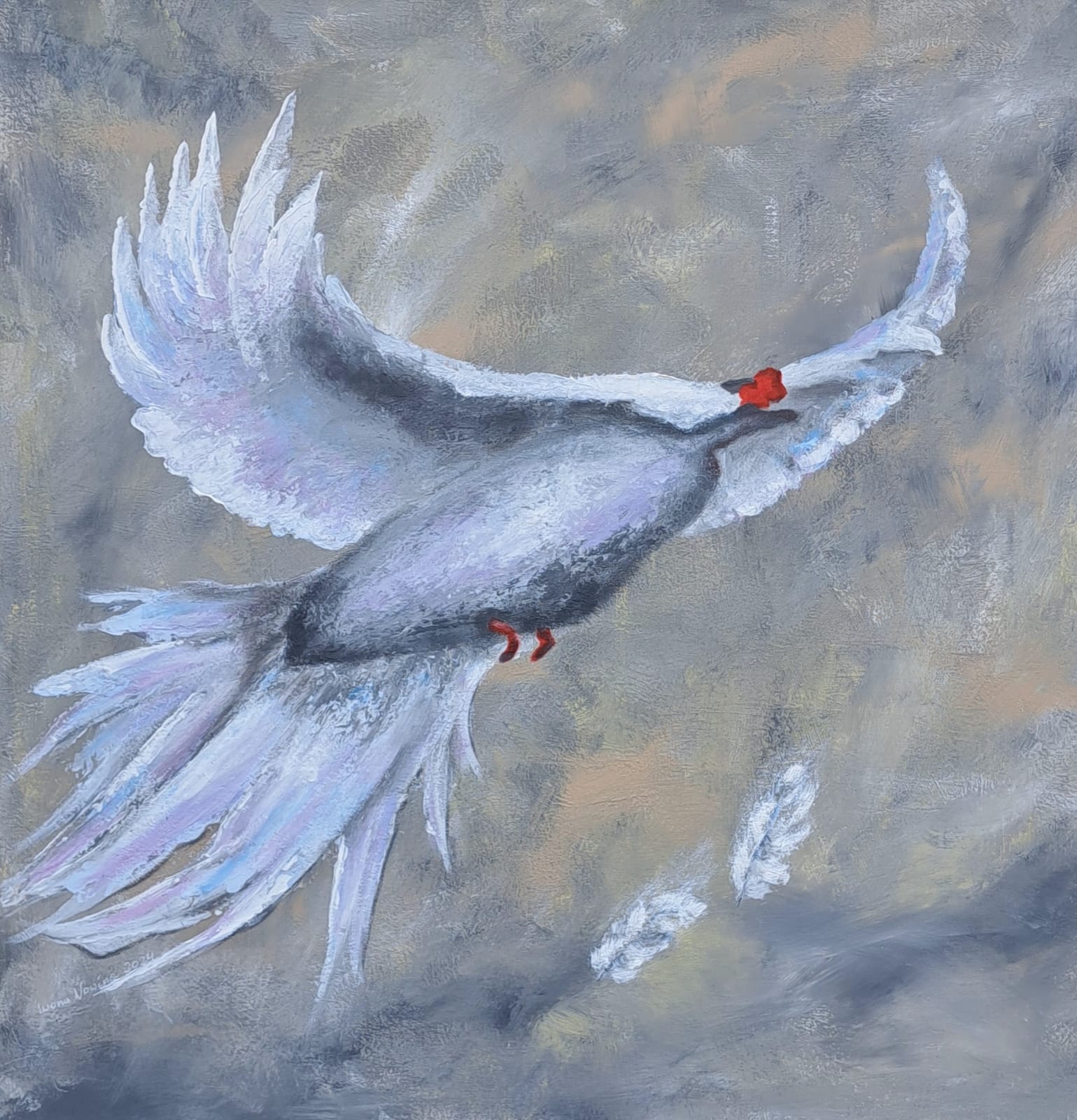 Obraz Wzlot jest efektem mojego odbioru rzeczywistości. Symbolizuje wzlot po upadku. Malowany farbami akrylowymi, pędzlem i szpachelką, stąd chropowata struktura powierzchni. Boki zamalowane w kolorze tła. Moje obrazy mają zamontowane zawieszki.