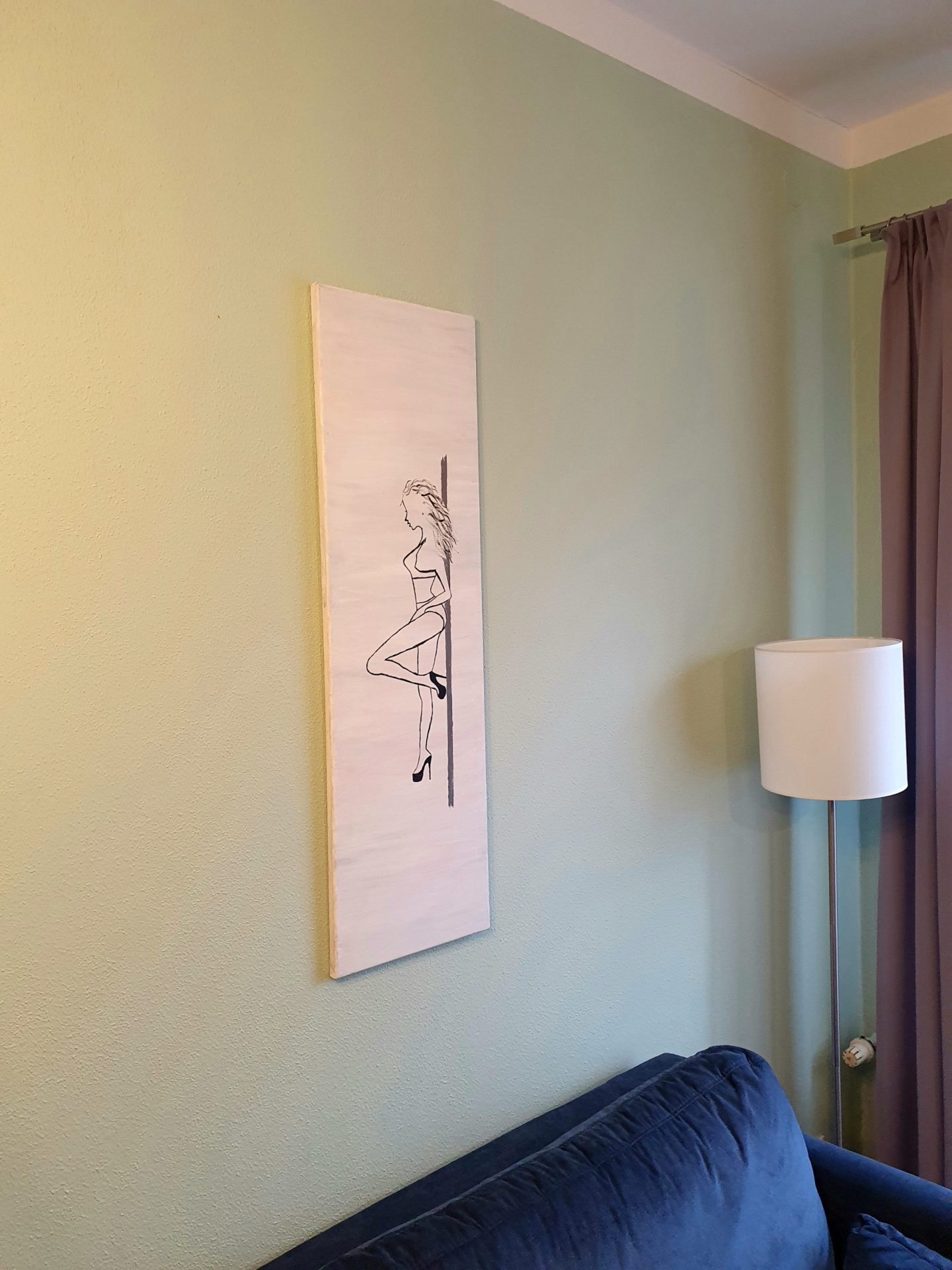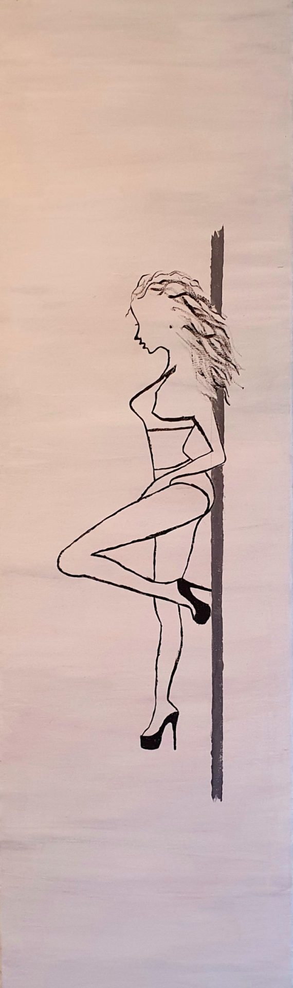 Zainspirowany figurą pewnej znajomej stworzyłem obraz przedstawiajacy zgrabną kobietę w szpilkach i bieliźnie, stojącą przy rurze do tańca.
