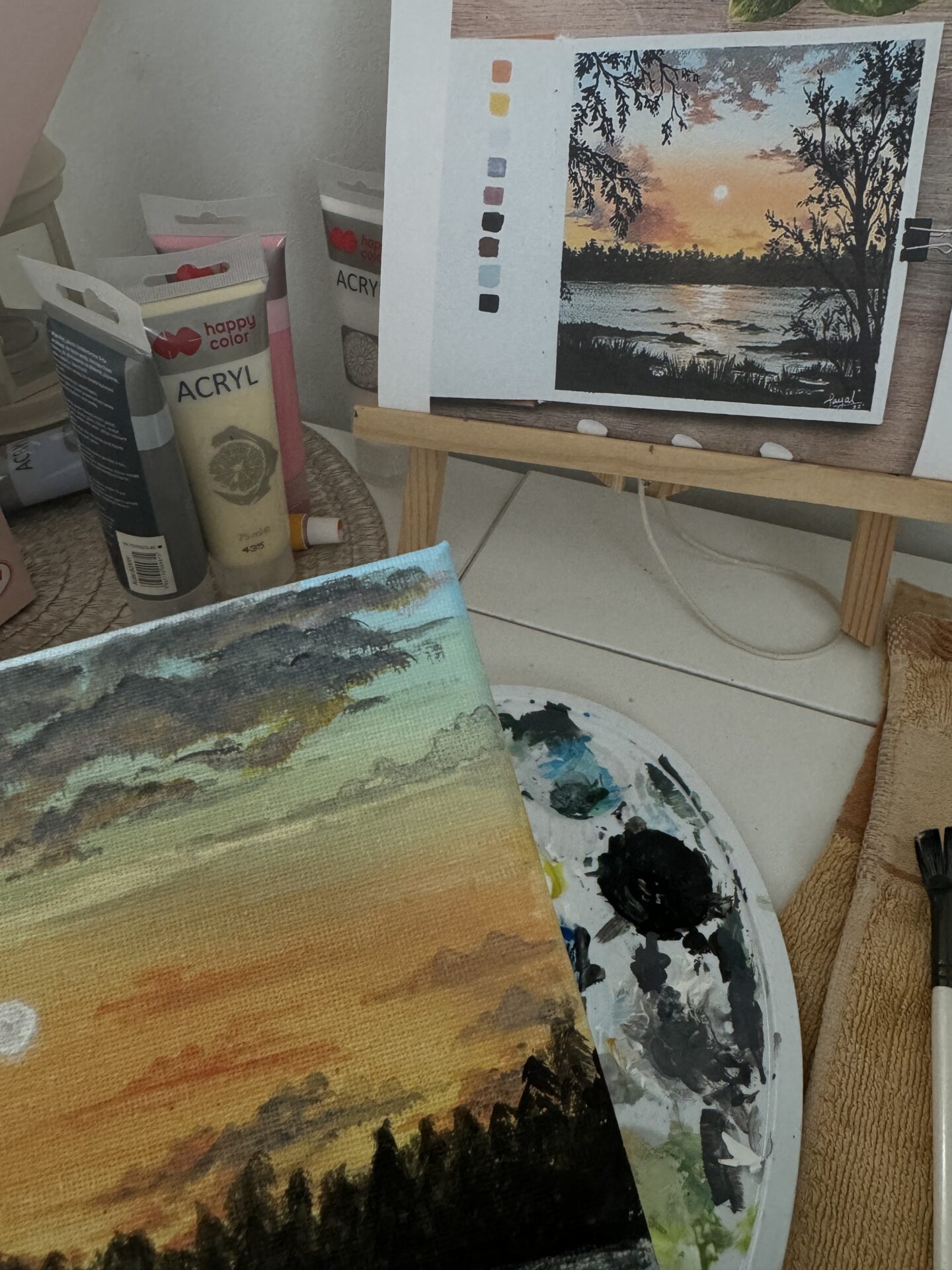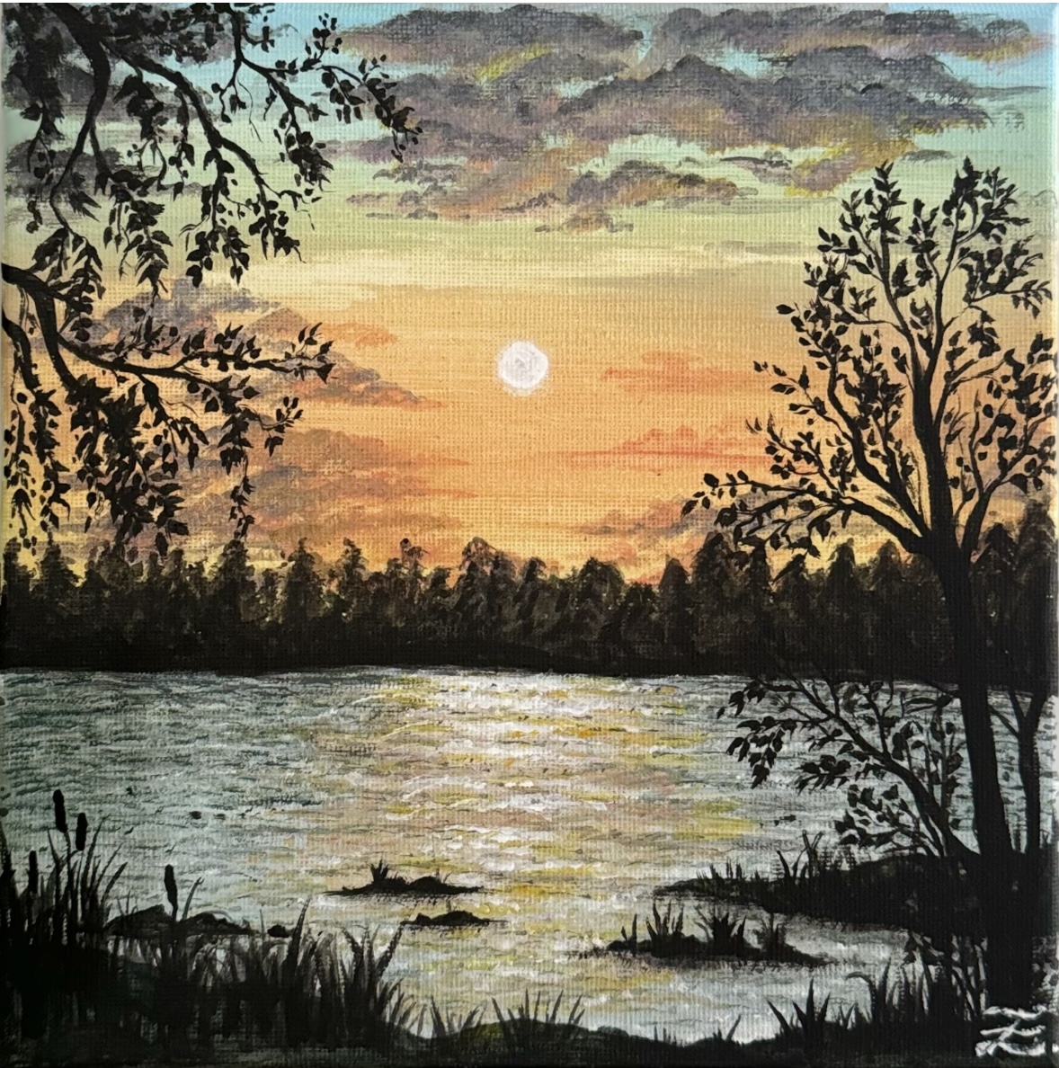 Zachód nad jeziorem – malowany farbą akrylową na płótnie