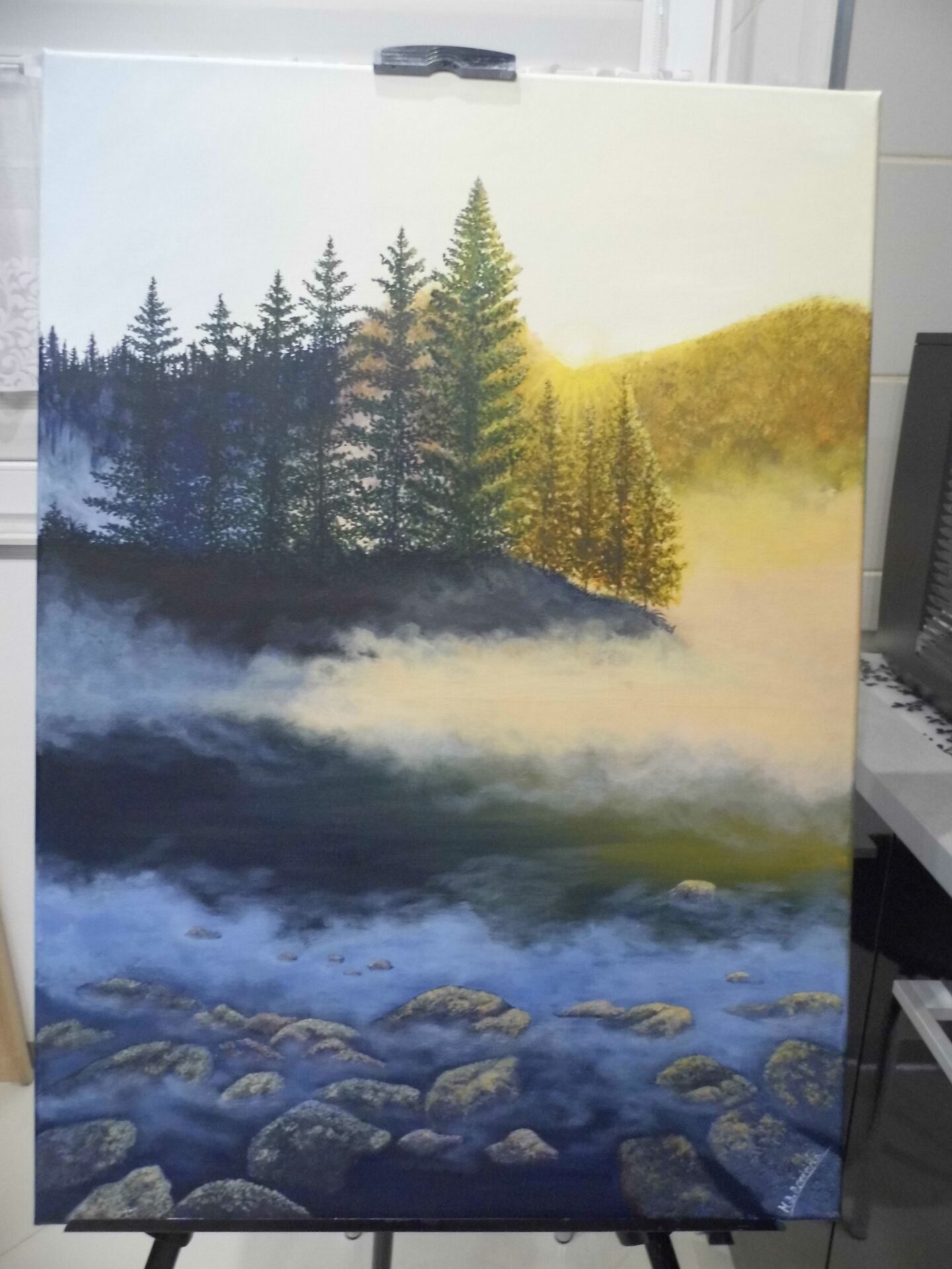 Przedstawiam obraz mojego autorstwa, ukazujący zachód słońca spowity mgłą, nad jeziorem. Praca do złudzenia przypomina fotografię co było dużym wyzwaniem i wymagało dużo pracy. Został namalowany pędzlem, profesjonalnymi farbami akrylowymi ( firm: Winsor & Newton, Amsterdam, Liquitex) na podobraziu malarskim o wysokiej jakości. Wymiary: 50 x 70 cm. Wykończony i zabezpieczony został werniksem. Podpis autora znajduje się na awersie. W razie dodatkowych pytań zapraszam do kontaktu.