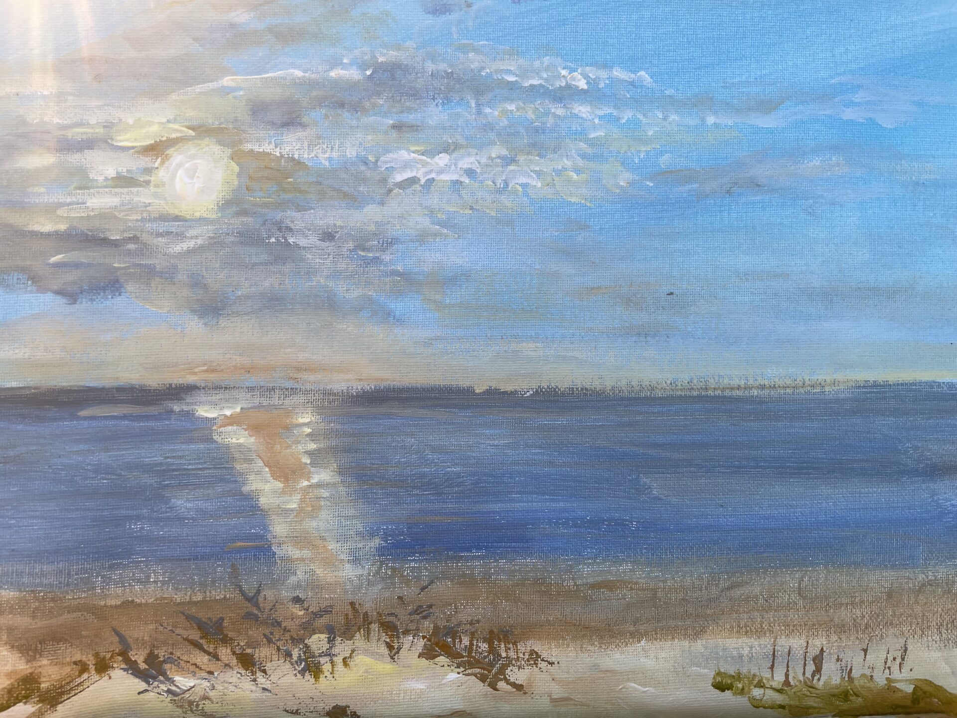 Obraz malowany w plenerze na Mierzei Wiślanej w Krynicy Morskiej z perspektywy wydmy . Uchwycona chwila zachodzącego słońca, światłem pokładającego się na powierzchni morza. Dominujący błękit nieba i morski granat zmierzwiony lekkimi falami. Obraz namalowany na płótnie 30×40 cm. Umieszczony w czarnej ramie, z białym pass-partout pod chroniącą folią.