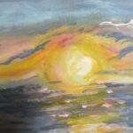 Słowa kluczowe: morze, morski, zachód, słońce, chmury, fale, żółty, niebieski, granat, różowy, ciepły, lato