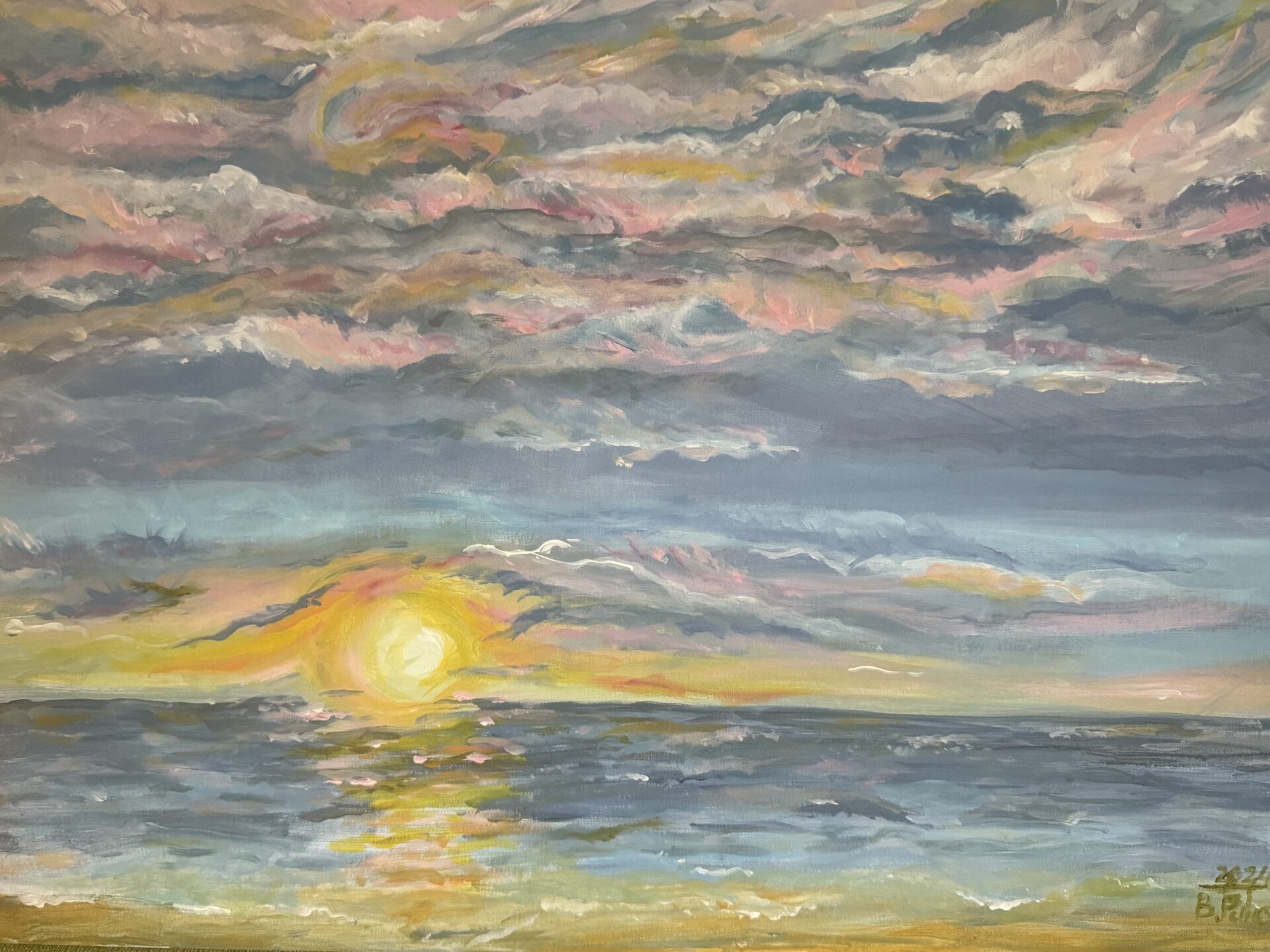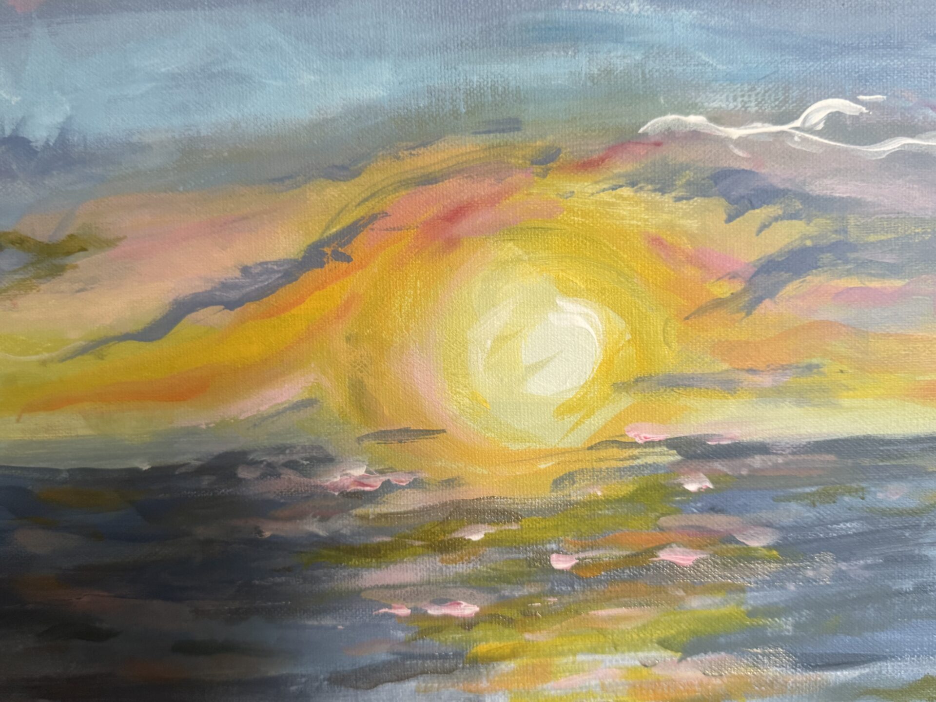 Obraz namalowany na płótnie (panel malarski) profesjonalnymi farbami akrylowymi 50×70 cm, pokryty satynowym werniksem.
