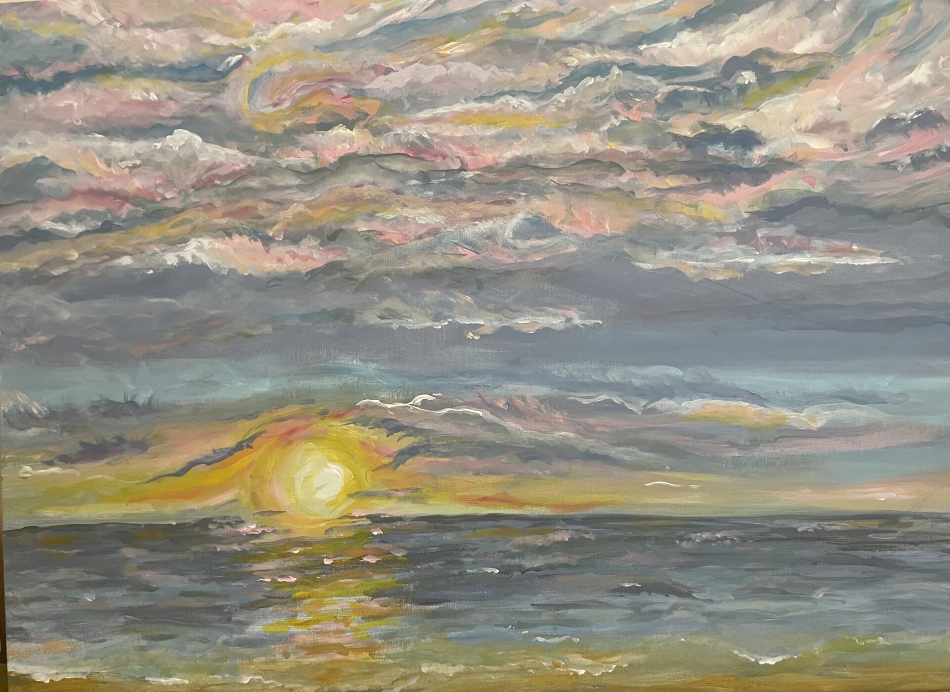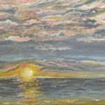 Klimatyczny obraz przedstawiający zachodzące słońce nad morzem . Zachód widziany z lini brzegowej. Niezwykle w kolorze i kształcie chmury późnego lata. Doskonały na prezent dla osoby kochającej morze i klimat zachodzącego słońca, ciepło barw i przestrzeń.