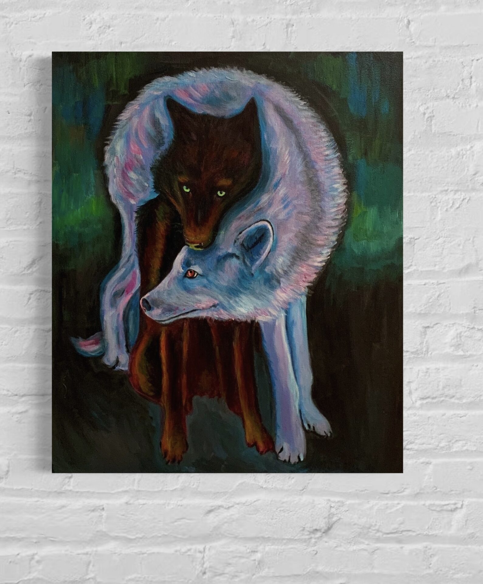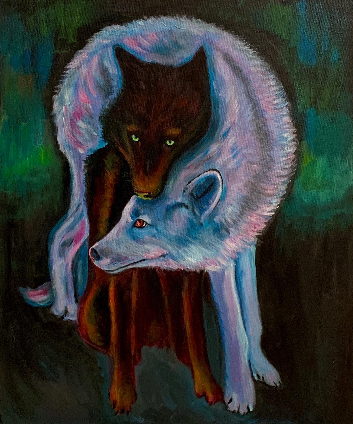 Obraz zakochanych wilków malowany ręcznie akrylami na płótnie. Wymiary – 60 x 50 cm